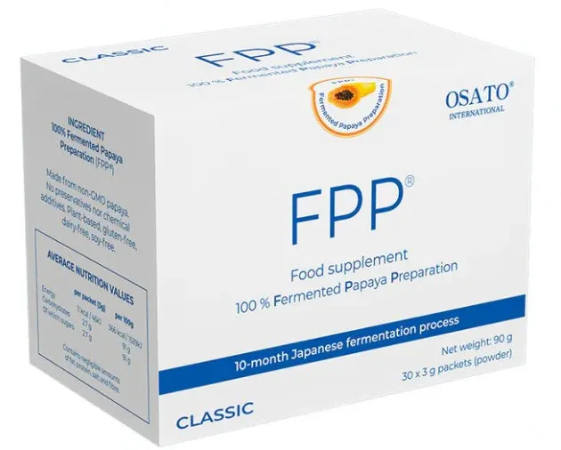 FPP® is an all-natural food supplement, made from 100% fermented papaya preparation (FPP®). FPP® is made through a 10-month patented Japanese fermentation process, from non-GMO Carica papayas.