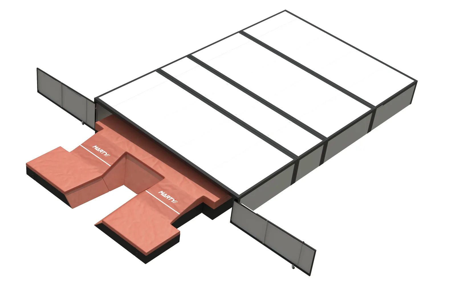 – Toit et côtés constitués par des panneaux en profils SPECIFIQUES MARTY section carré 60mm soudés avec remplissage en tôle aluminium épaisseur 2mm insérée dans une feuillure spécialement adaptée.
