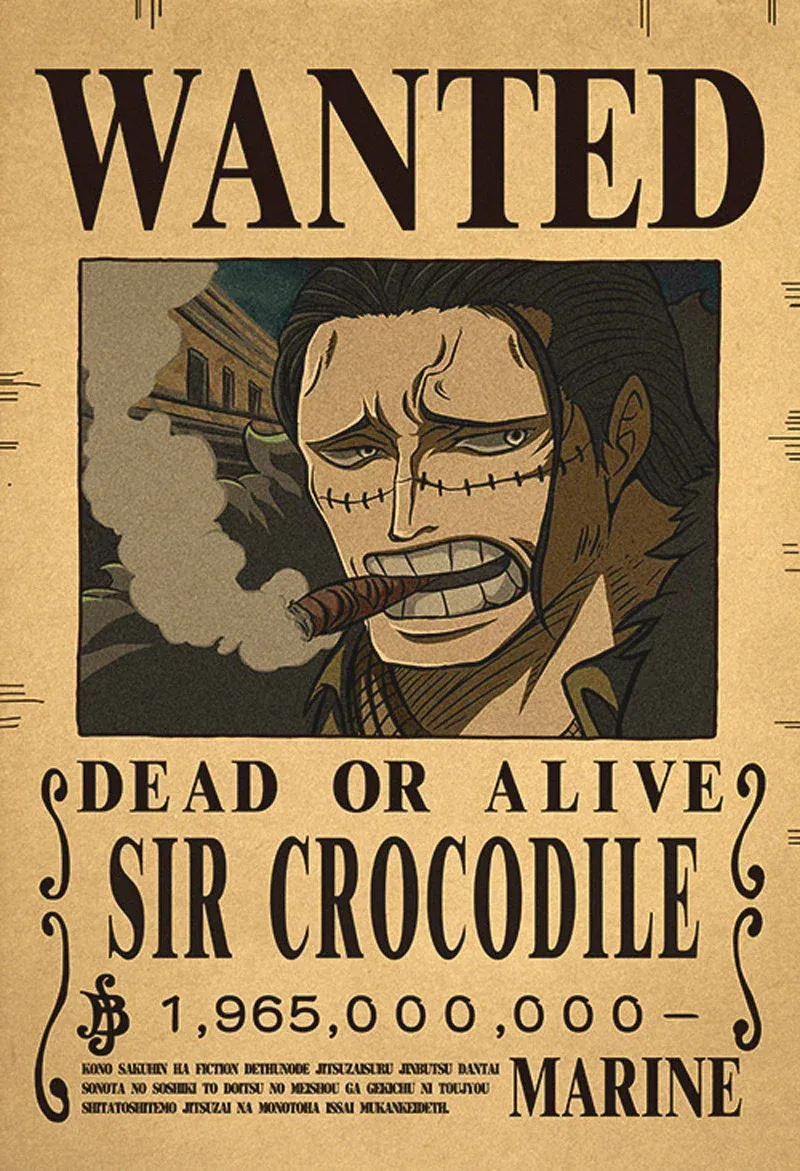 Voici l’affiche Wanted de Sir Crocodile, avec une prime imposante de 1,965 milliards de berry. Cet ancien Shichibukai, maintenant membre clé de la Cross Guild aux côtés de Baggy et Mihawk, est plus dangereux que jamais.