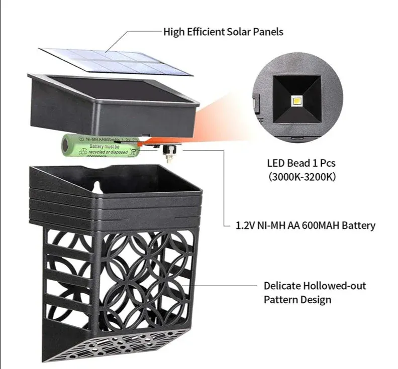 Les cellules photovoltaïques assimilent la lumière du soleil pendant la journée pour remplir les accumulateurs, qui allument ensuite l’ampoule LED la nuit. Comme les lumières sont alimentées par l’énergie solaire, elles doivent être mises dans un endroit qui reçoit le maximum de soleil, idéalement huit à dix heures ou plus par journée.