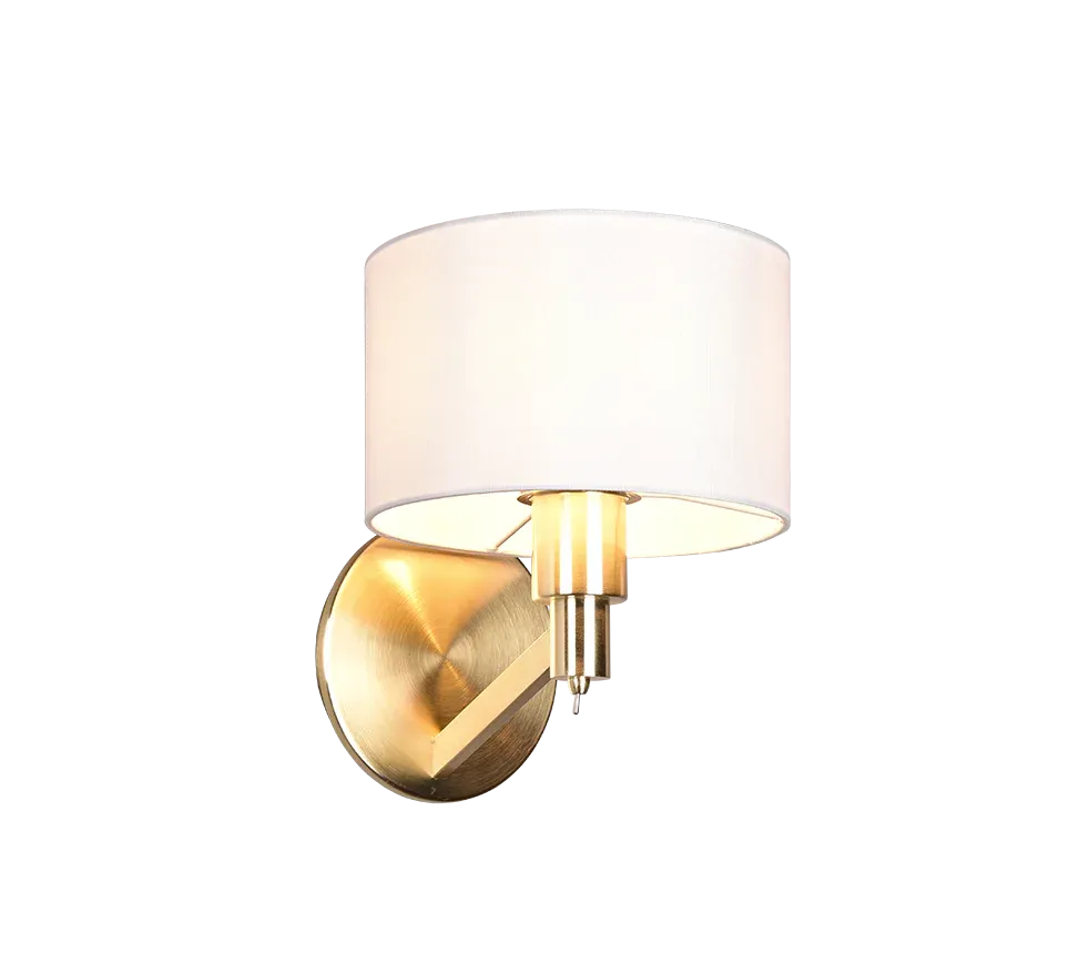 Le corps est en métal doré. L’abat-jour en tissu blanc. Installation directe dans le mur, sans cordon extérieur.