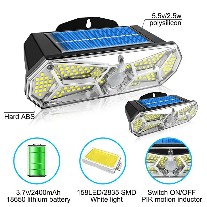 Applique solaire murale avec détecteur de mouvement idéale pour éclairer votre jardin. Avec la puissance des 158 LED économe et ses 8 grands angles, c’est l’éclairage facile à installer parfait pour votre maison. Adoptez l’énergie verte pour une maison plus écoresponsable.