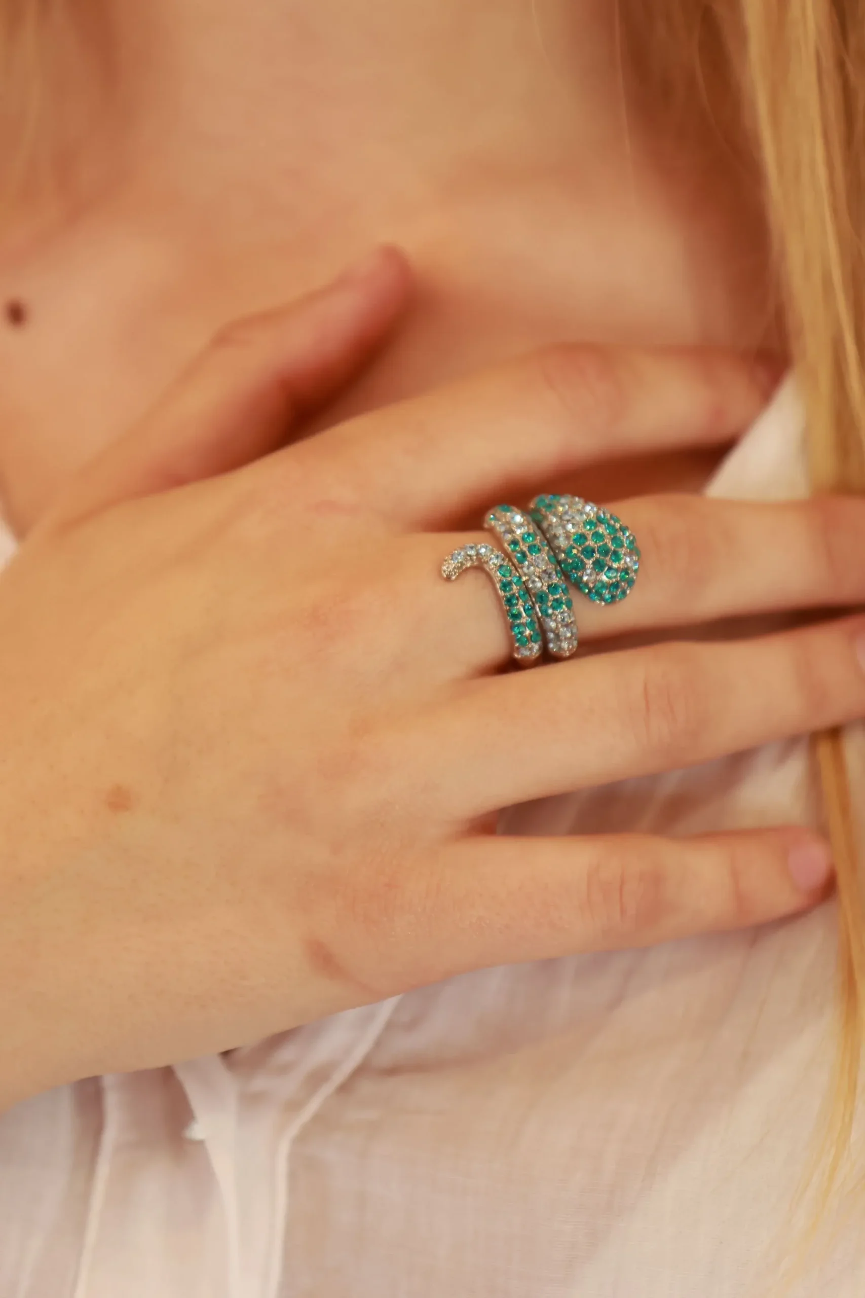 Envie d’un bijou qui hypnotise et libère ton côté sauvage ? La bague « Marina » signée Jade et Julie est une œuvre d’art à enrouler autour de ton doigt ! Inspirée d’un serpent majestueux, elle s’enlace gracieusement avec une forme sinueuse, sa tête ornée d’une explosion de cristaux turquoise éclatants et de strass blancs scintillants qui évoquent les profondeurs d’un océan scintillant. Les écailles, délicatement incrustées de pierres bleues et blanches, captent la lumière à chaque mouvement, tandis que sa base dorée apporte une touche chaleureuse et élégante.