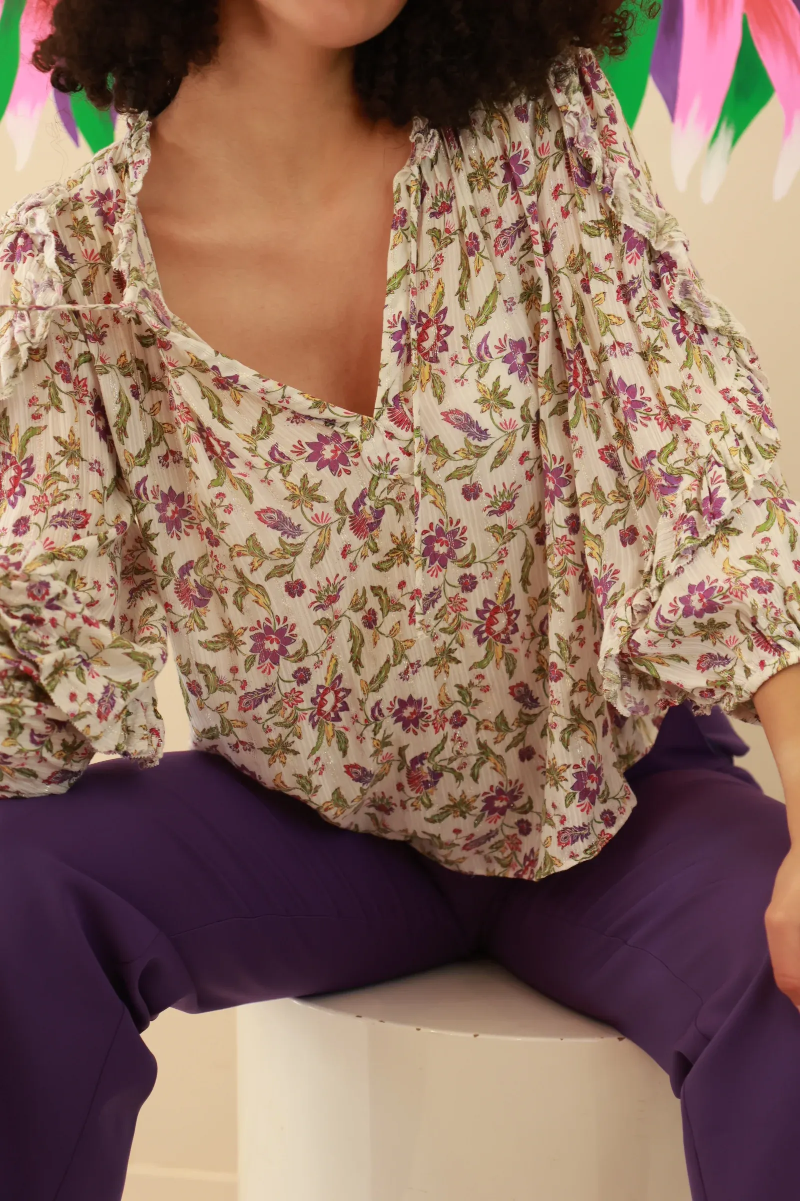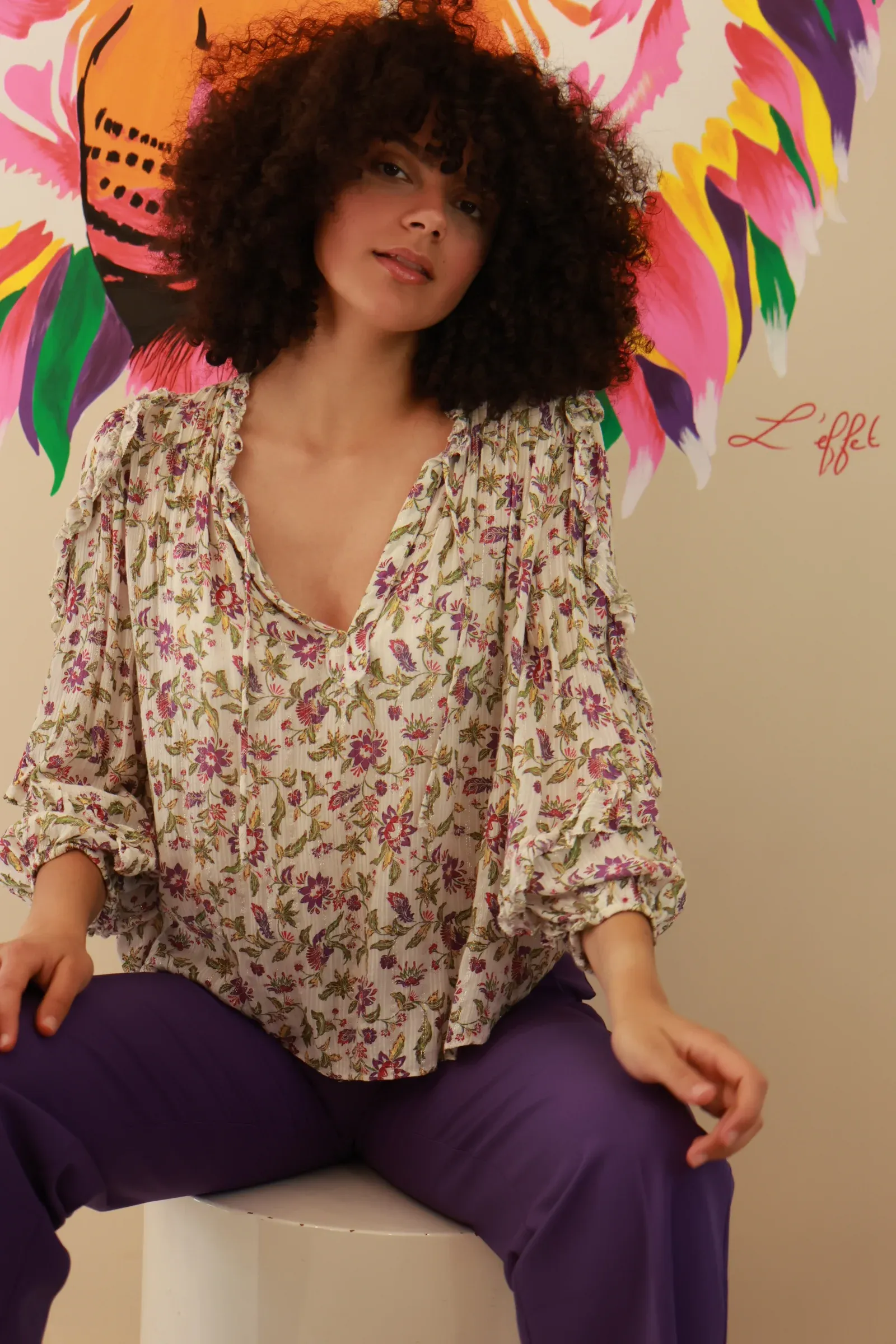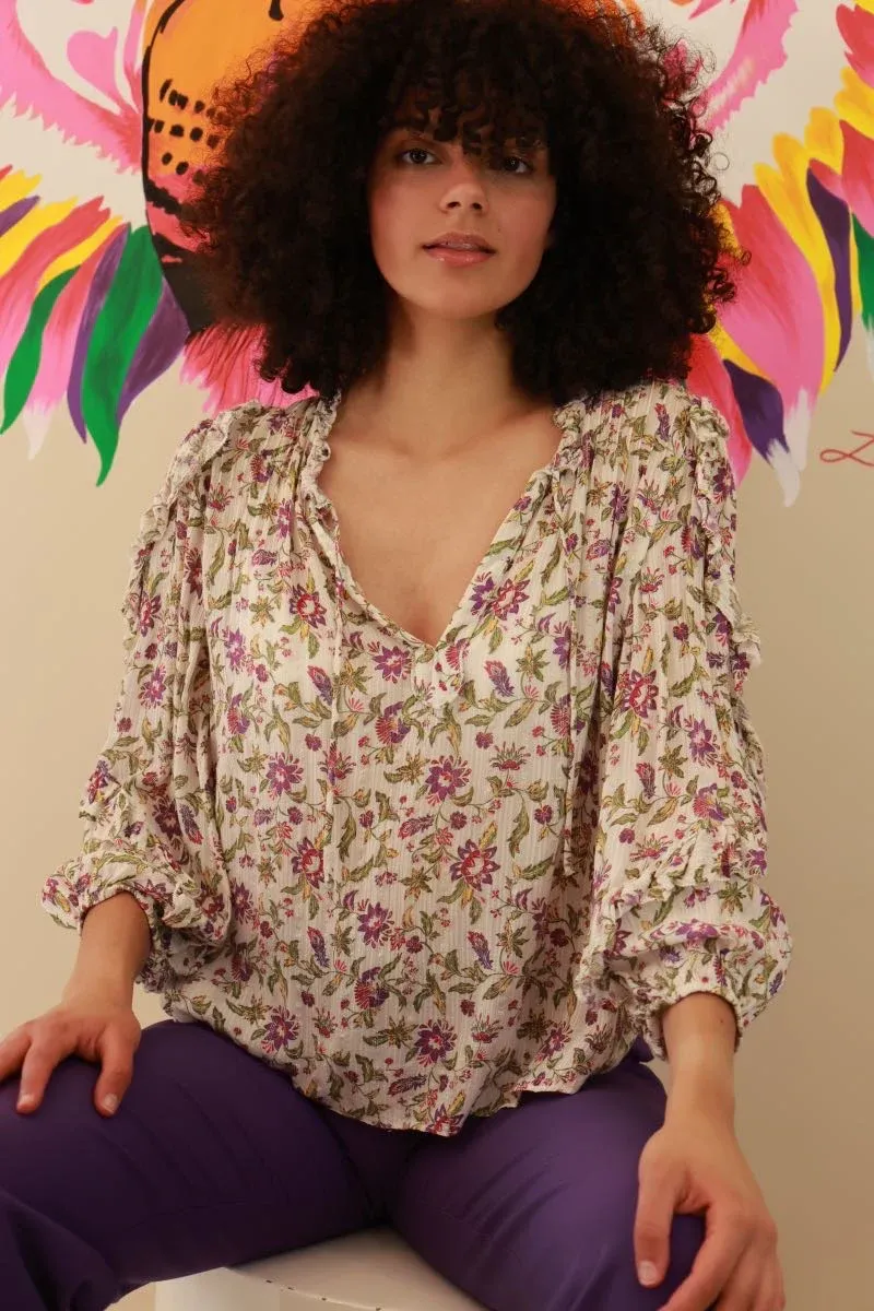 Un vent de bohème souffle sur votre dressing avec cette blouse fleurie signée Bérénice, une marque française adorée pour ses coupes féminines et ses détails subtils. Ici, on craque pour cet imprimé floral aux tons parme, vert et rouge, réhaussé d’un discret fil lurex doré qui capte la lumière avec élégance.