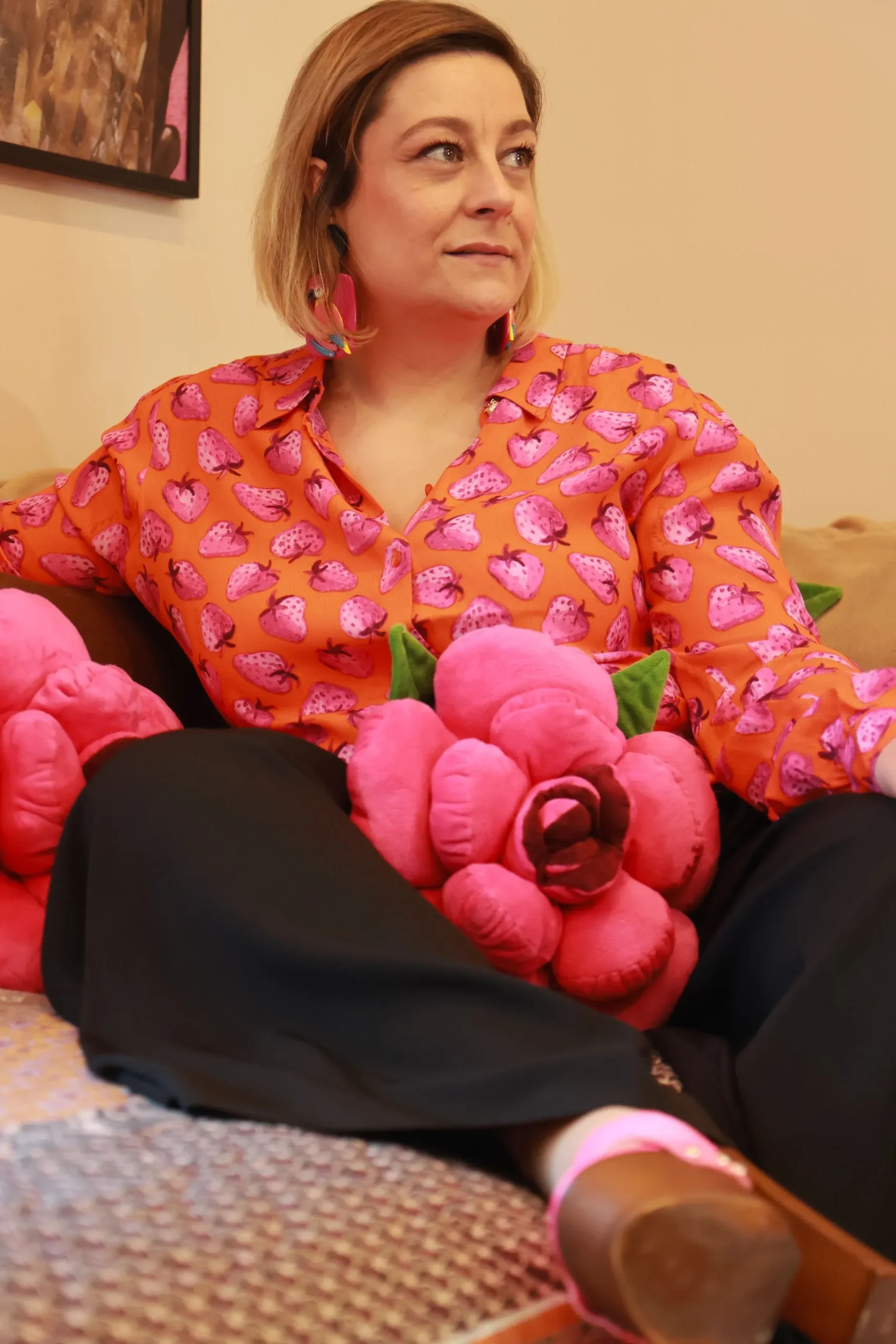 - 🍓 Imprimé fruité : Fraises dans des tons tangerine et rose pour un look pétillant et estival.
