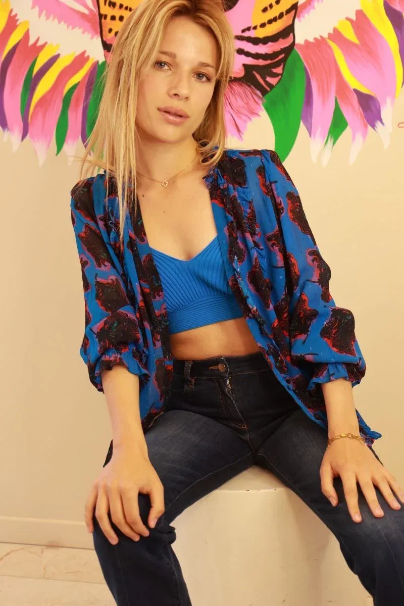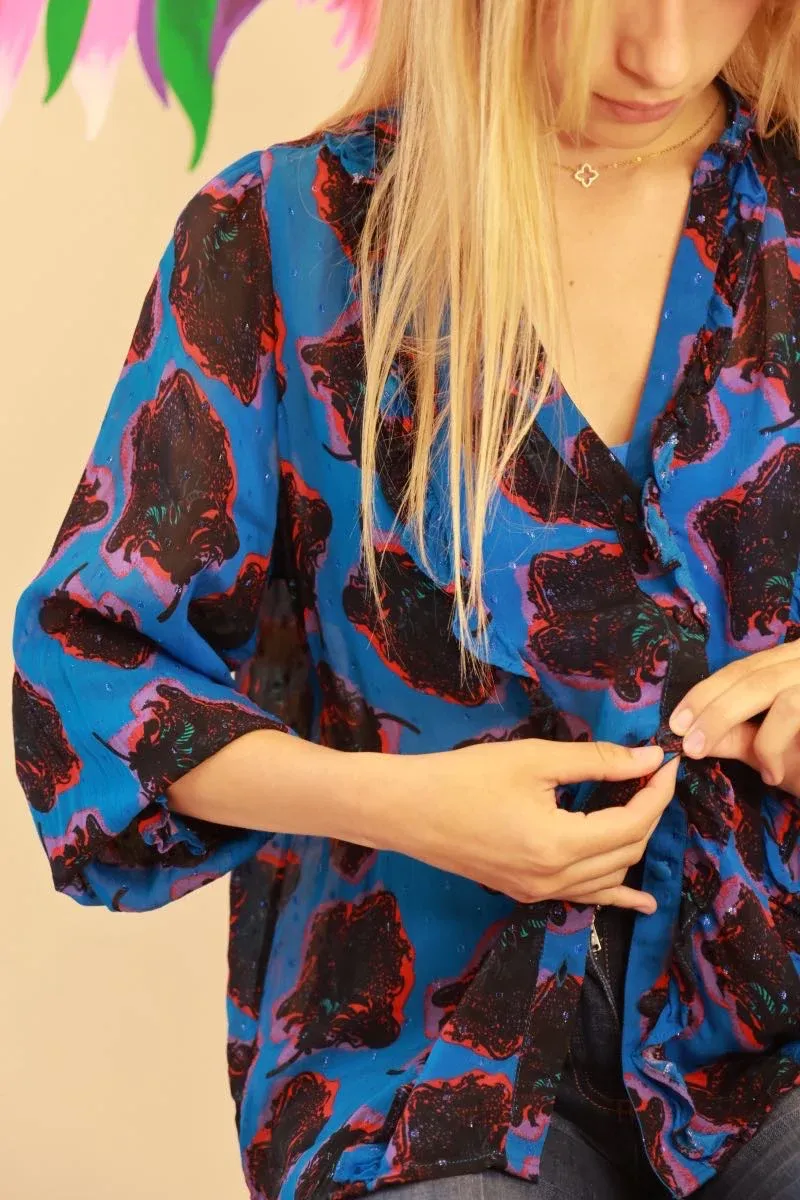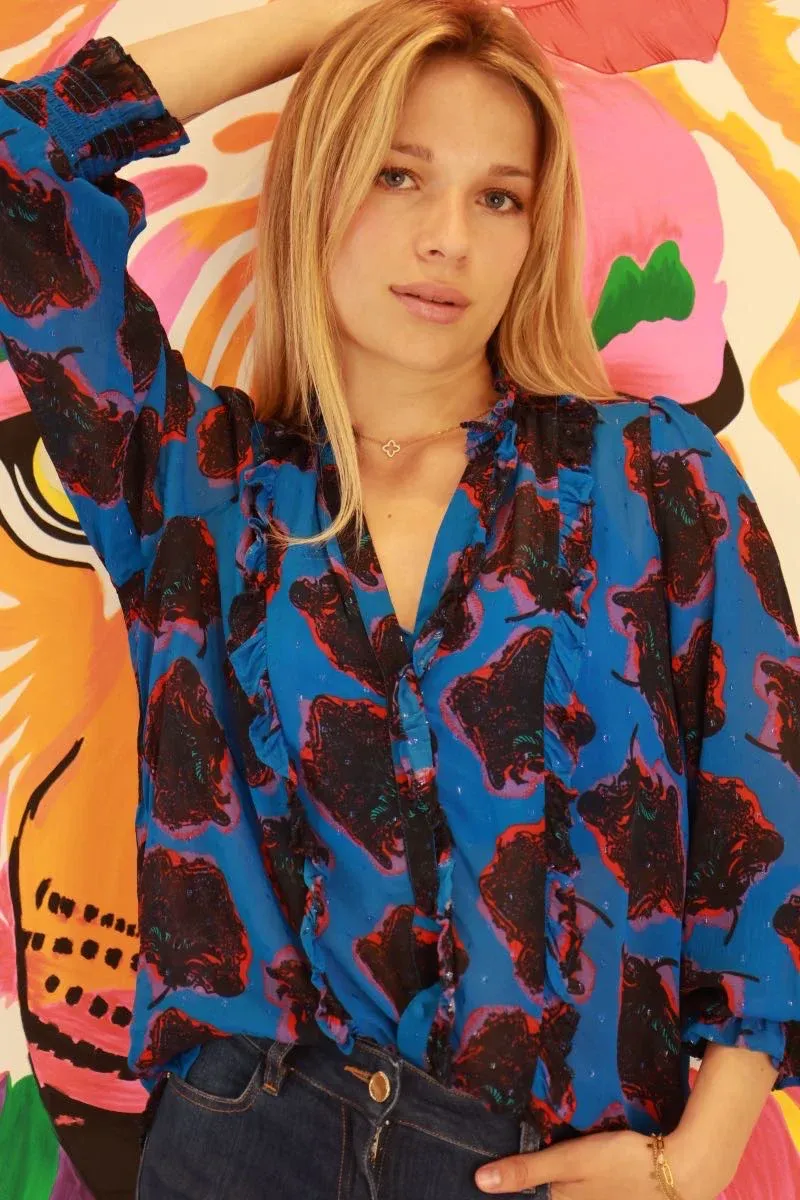Laisse-toi emporter par le charme unique de cette blouse Pom Amsterdam, une pièce de seconde main qui respire l’élégance bohème ! En taille 38, elle se pare d’un bleu éclatant sublimé par un imprimé audacieux de motifs abstraits noirs et rouges, comme une toile d’artiste qui raconte une histoire. Ses manches longues, agrémentées de fronces délicates aux poignets, et son col en V orné de volants ajoutent une touche féminine et romantique, parfaite pour twister tes tenues avec style.