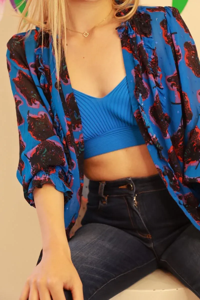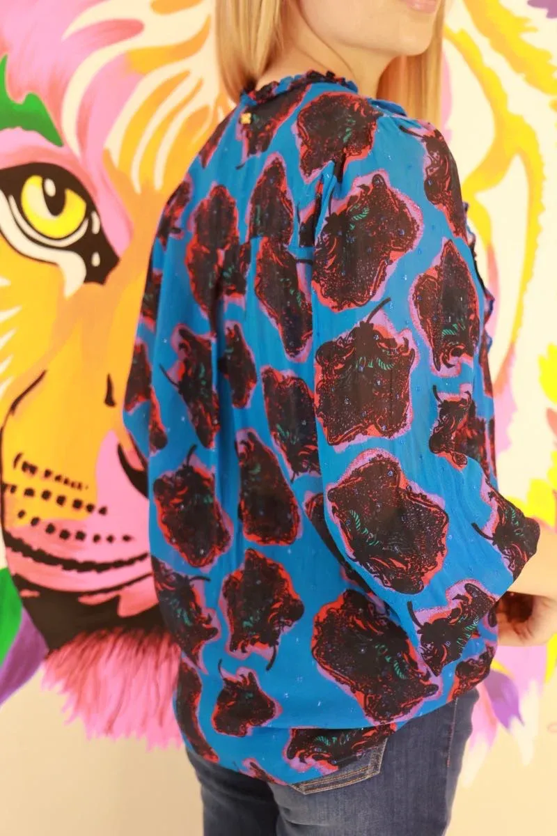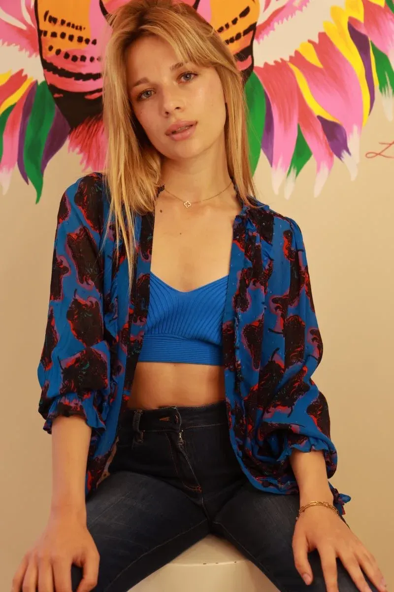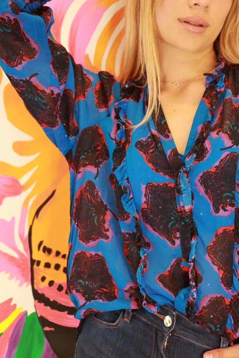 Laisse-toi emporter par le charme unique de cette blouse Pom Amsterdam, une pièce de seconde main qui respire l’élégance bohème ! En taille 38, elle se pare d’un bleu éclatant sublimé par un imprimé audacieux de motifs abstraits noirs et rouges, comme une toile d’artiste qui raconte une histoire. Ses manches longues, agrémentées de fronces délicates aux poignets, et son col en V orné de volants ajoutent une touche féminine et romantique, parfaite pour twister tes tenues avec style.