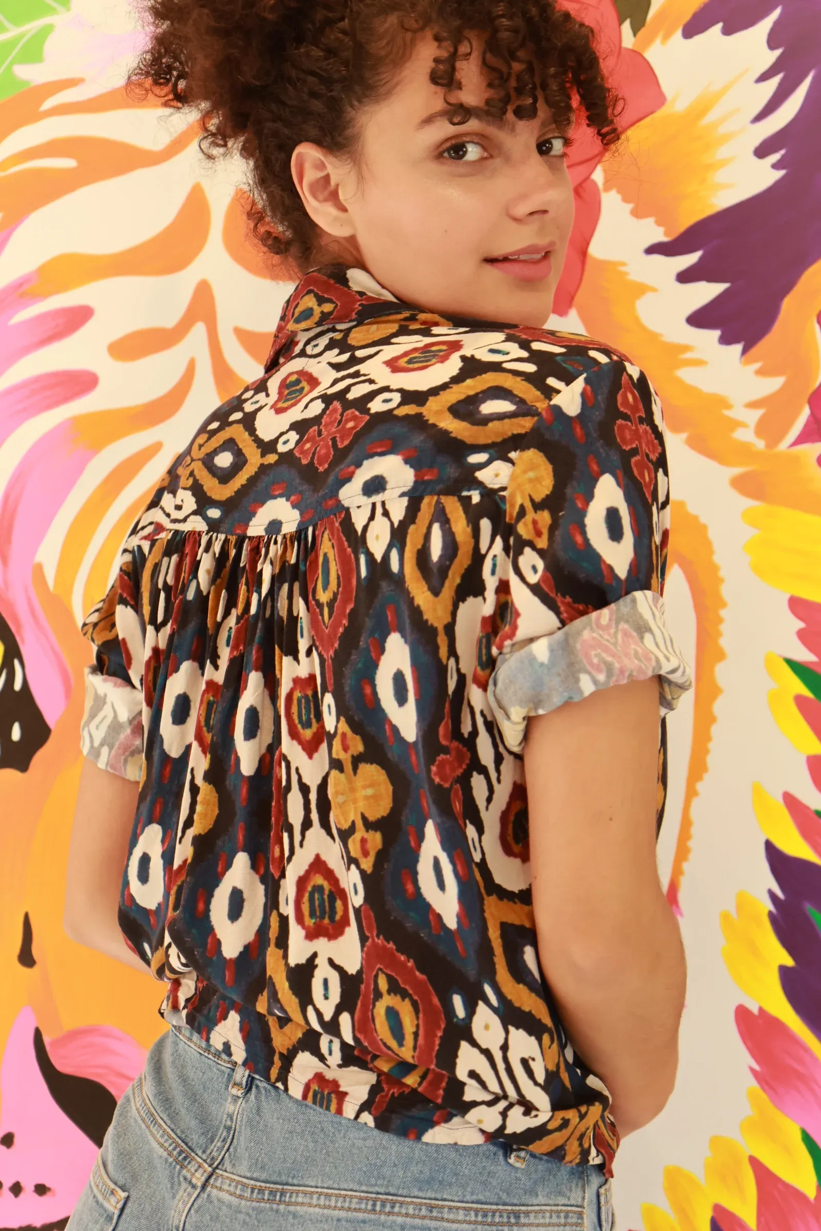 Ici, c’est le charme des imprimés ethniques qui s’exprime dans toute sa splendeur. Cette chemise légère en viscose de la marque Stella Forest affiche une palette vibrante aux tons chauds, mêlant bleu profond, ocre, crème et bordeaux. Une pièce au look bohème affirmé, facile à mixer avec du jean ou du blanc pour un style qui envoie.