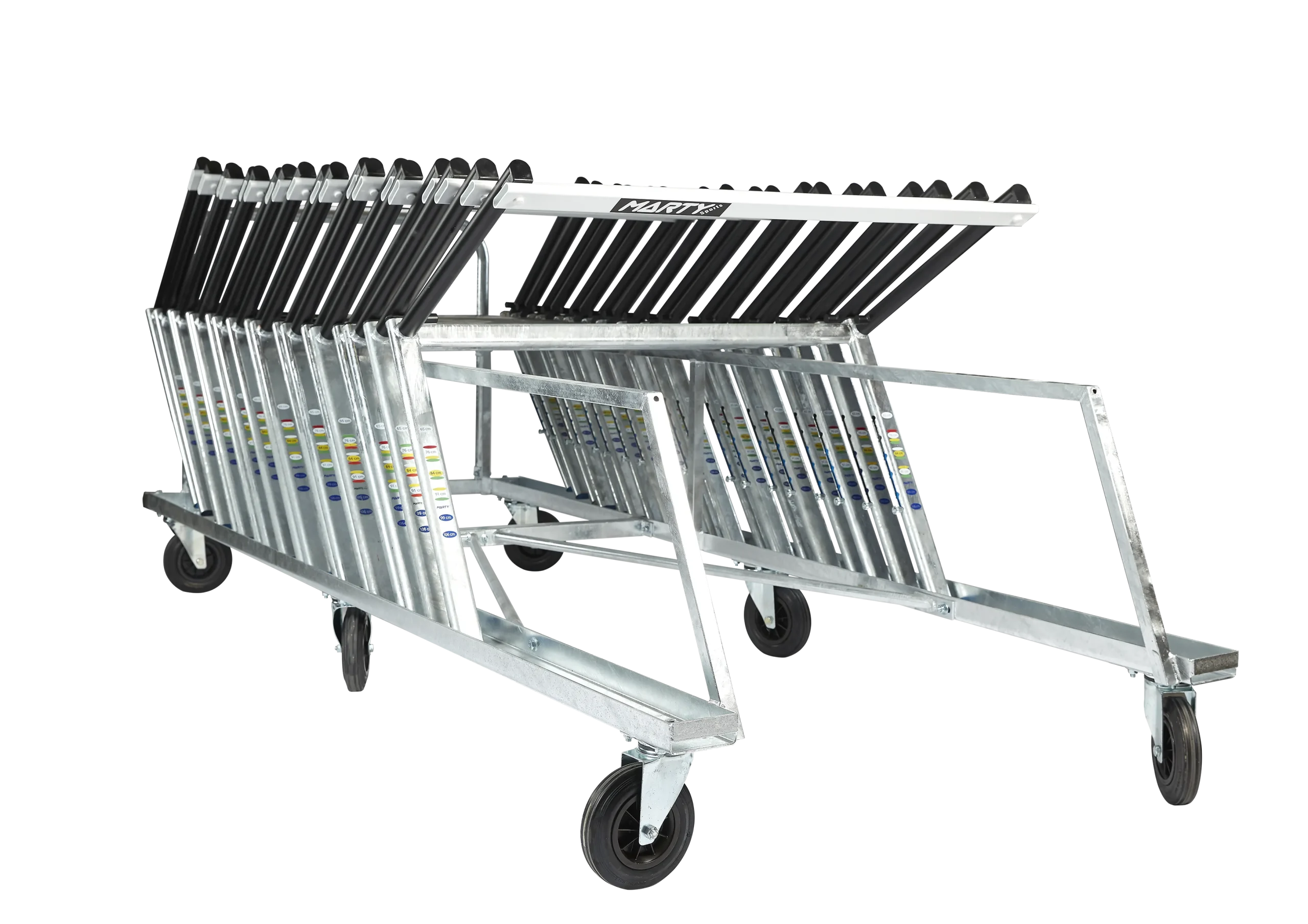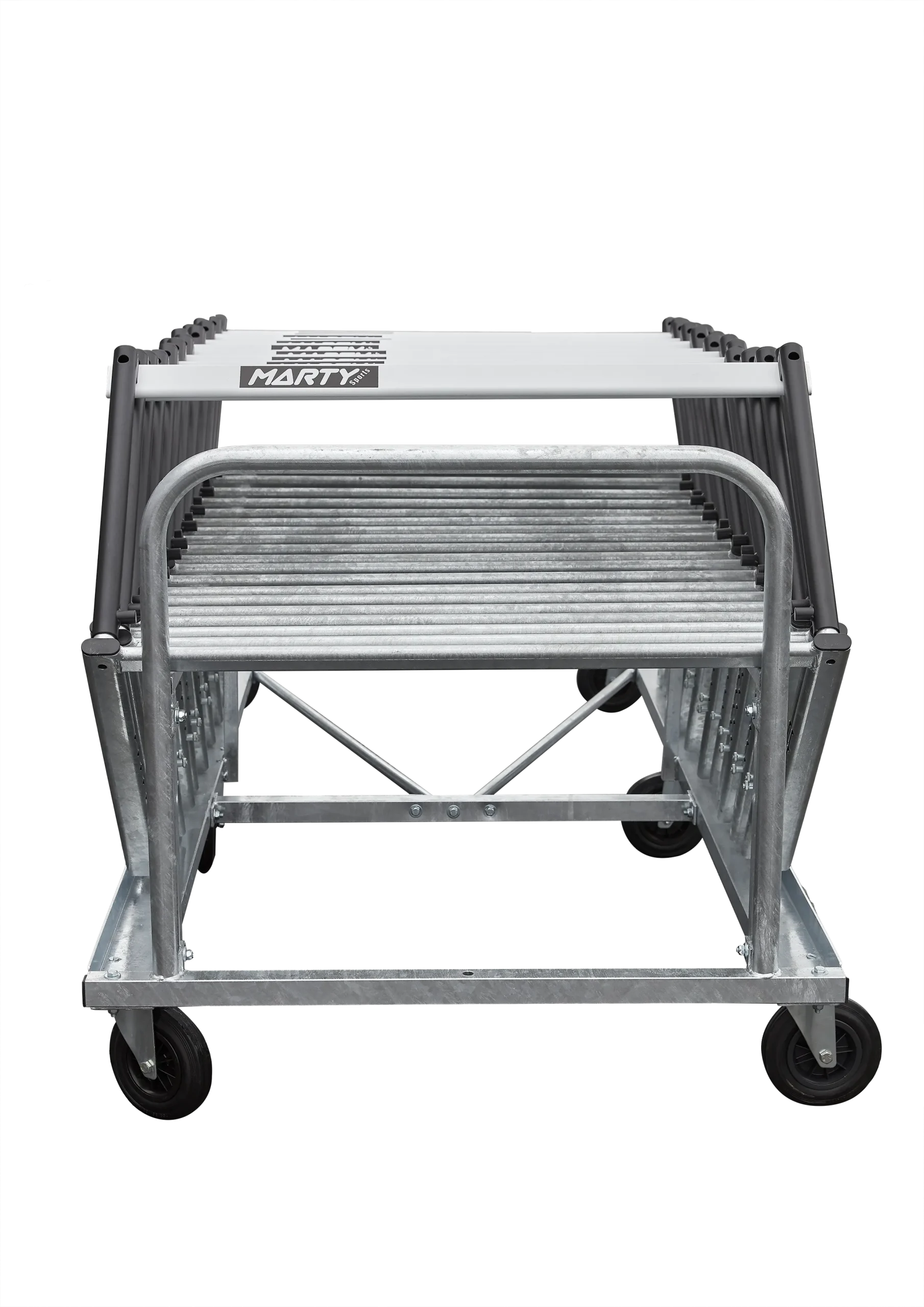 Modèle métallique GALVANISE A CHAUD – TRES RESISTANT avec 6 grosses roues diamètre 200mm dont 4 pivotantes. Renfort en V permettant l’accès intérieur.