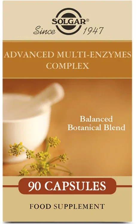 Solgar® Advanced Multi-Enzyme Complex is a unique blend of naturally derived enzymes and botanicals to help support your digestive system and the absorption of your food.