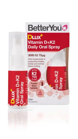 BetterYou™ DLux+ Vitamin D+K2 Oral Spray is an optimum strength spray delivering 3000iu of vitamin D alongside 75μg of vitamin K2 per dose (3 sprays).
