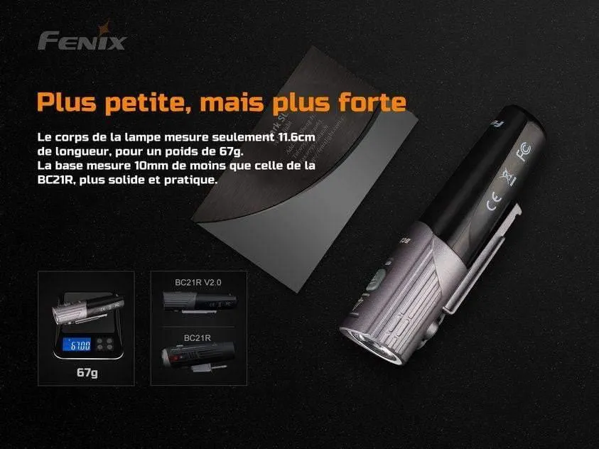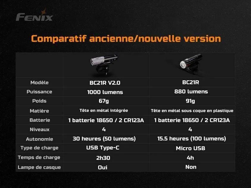 La lampe de vélo améliorée Fenix BC21R V2.0 affiche désormais un total de 1000 lumens pour un poids total de 67g. Le port USB a également été mis à niveau vers le port USB de type C ultra-rapide avec un temps de charge total de seulement 2,5 heures. Vous n’avez pas de prise de courant pour charger le BC21R? Utilisez simplement deux CR123A comme alternative de secours. La tête d’éclairage de vélo est fabriquée à partir d’aluminium durable pour aider à la dissipation de chaleur. Le commutateur unique vous permet d’activer et de parcourir tous les modes de sortie. Il est facile de fixer la BC21R V2.0 à votre vélo avec le support de vélo à fixation rapide inclus . Cette nouvelle lampe de vélo a un indice de protection IP66 contre les particules de poussière et surtout les fortes pluies ou les éclaboussures. Le système de faisceau à double distance vous permet de rouler en toute sécurité sur la route tout en protégeant la visibilité des cyclistes venant en sens inverse.