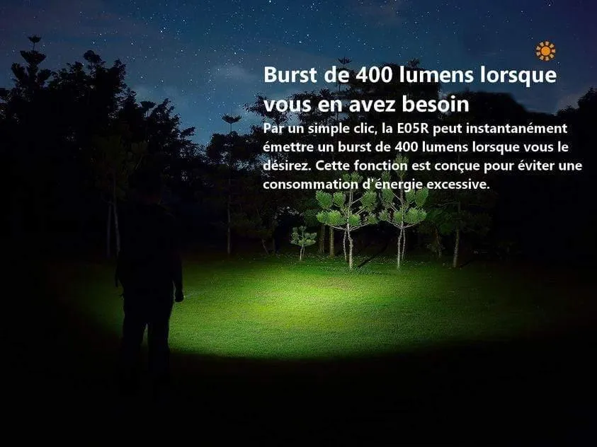 La recharge est facilitée par un port micro USB intégré, offrant une solution pratique pour maintenir votre lampe toujours prête à l’emploi. Avec une autonomie maximale impressionnante de 30 heures, la E05R est conçue pour être un compagnon fiable pour toutes vos aventures ou tâches quotidiennes, minimisant le besoin de recharges fréquentes.