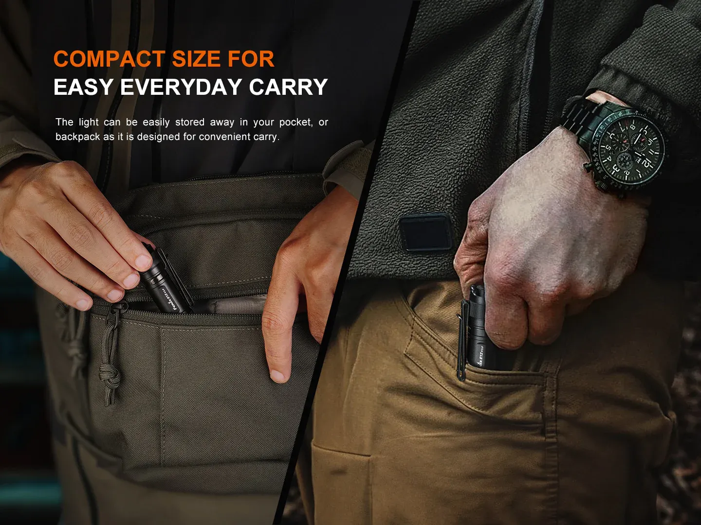 La Fenix E12 V3.0 est une lampe de poche portable EDC légère. Alimentée par une seule pile AA, la lampe de poche a une puissance maximale de 200 lumens et peut projeter un faisceau jusqu’à 78 mètres pour répondre à vos besoins d’éclairage. L’alimentation de la batterie ne sera pas consommée en état de veille, ce qui fournit suffisamment d’énergie pour chaque utilisation. Le clip de corps bidirectionnel et le culot magnétique permettent une utilisation pratique et mains-libres. Les autres points forts sont la possibilité de se tenir debout sur le culot et la protection IP68. Que vous soyez au travail ou en déplacement, la Fenix E12 V3.0 sera toujours là pour vous éclairer.