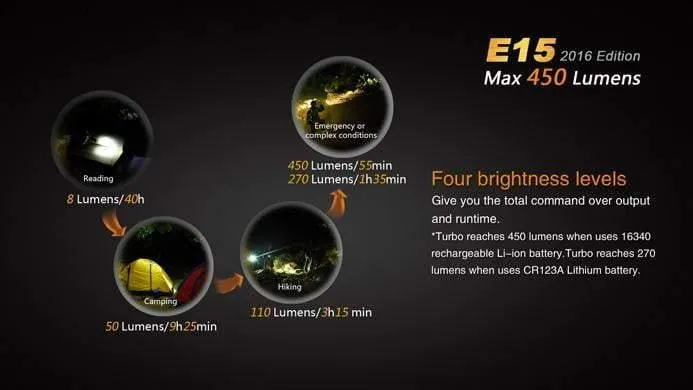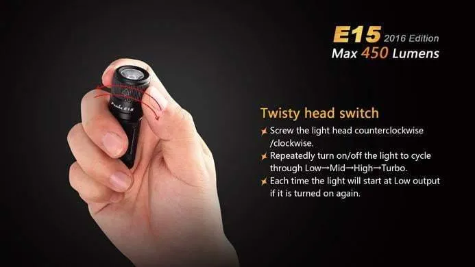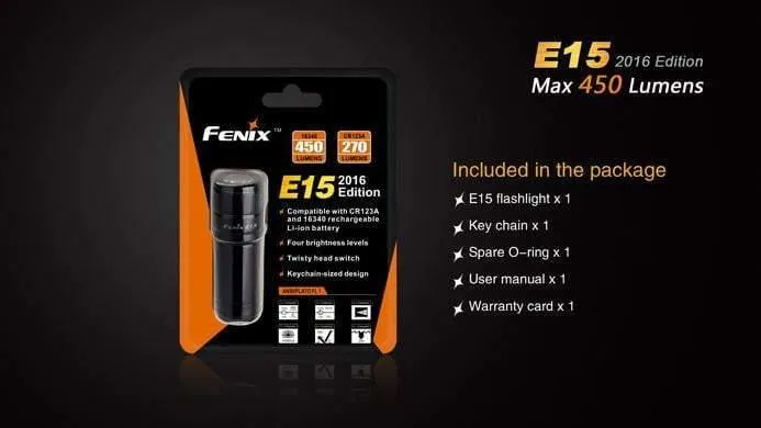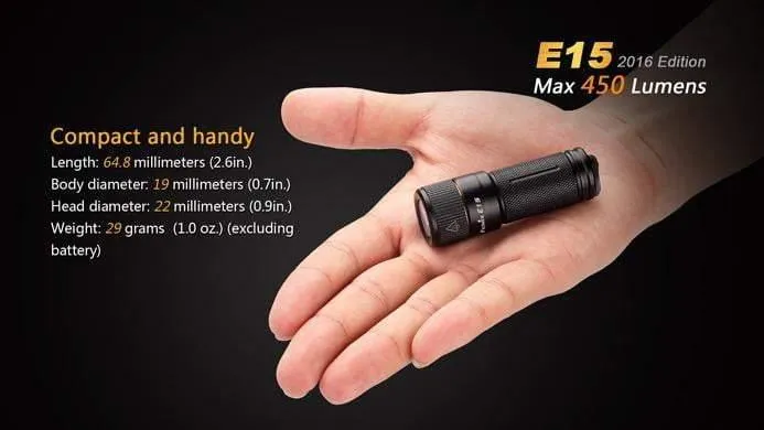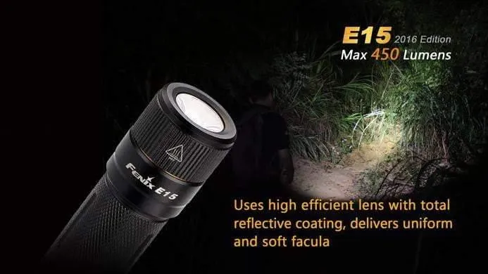 La Fenix E15 est une lampe de poche LED de haute qualité utilisant une ampoule LED Cree XP-G2 R5 ultraclaire.