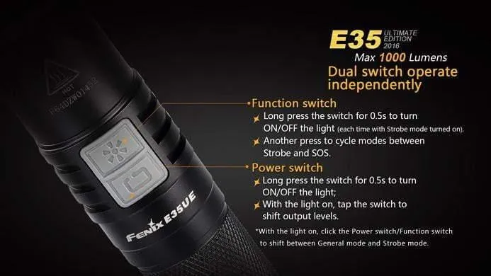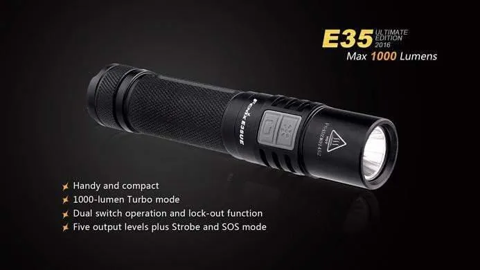 L’édition 2016 du modèle Fenix E35UE donne un gros coup de poing. Seulement 12,20cm et 1000 Lumens, cette lumière sera rapidement sur votre liste de lampe torche LED préférée. Conçu avec un interrupteur double sur le côté facile à utiliser, la Fenix E35UE édition 2016 sera facile à utiliser dans une situation. Avec sa taille compacte et ses fonctionnalités faciles, il serait difficile de ne pas utiliser cette lumière tous les jours. La fenix E35UE s’adaptera dans n’importe quel espace, ce qui en fait l’une des meilleures lanternes quotidiennes. Elle peut être alimenté par un seul accu 18650 ou deux CR123A.