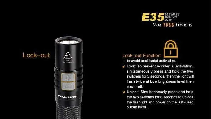 - Deux batteries CR123A non rechargeables . (Fenix ne recommande pas les piles CR123 rechargeables car elles ne fonctionneront pas selon le tableau de spécifications inclus pour l’édition E35UE 2016)