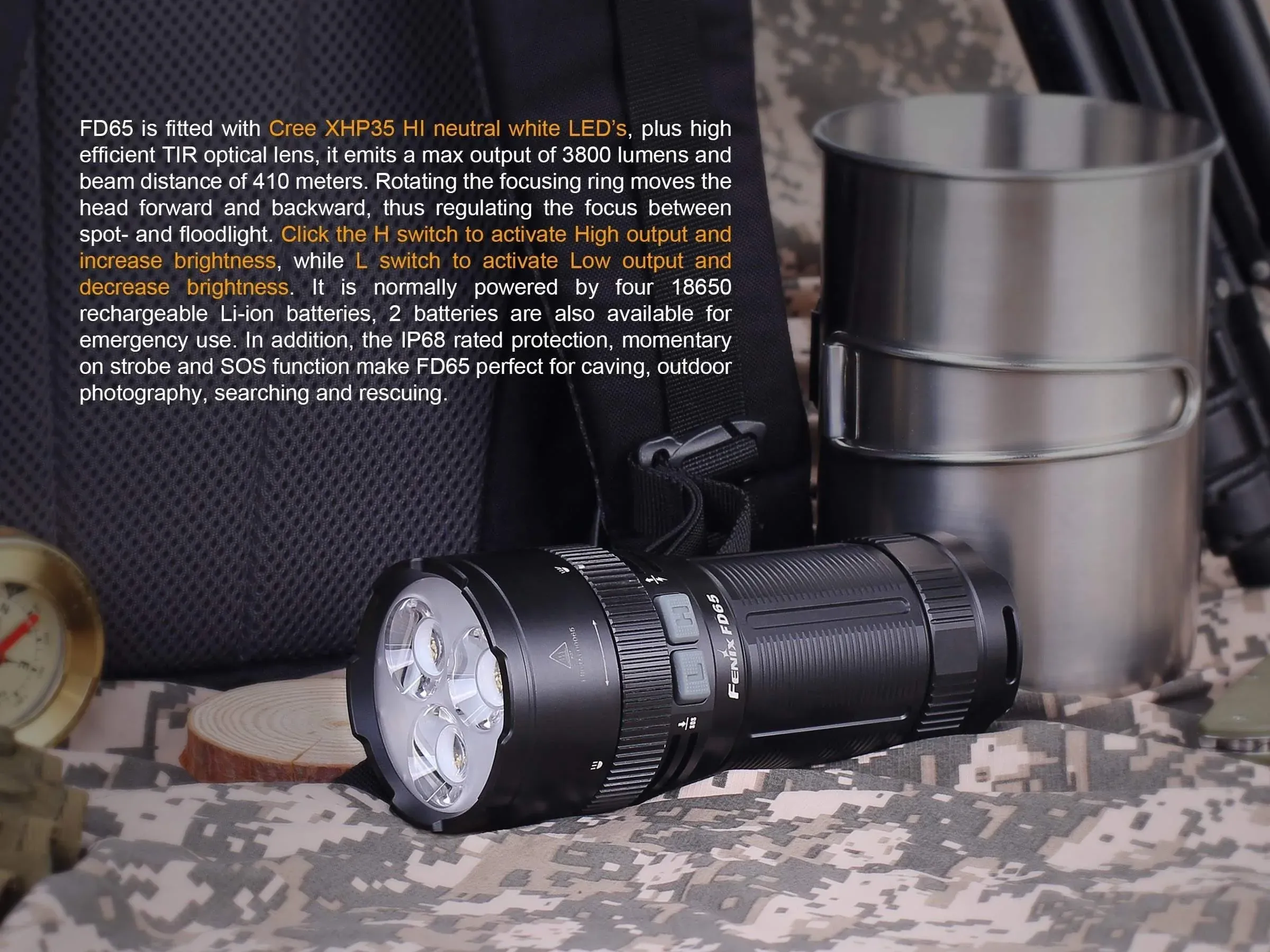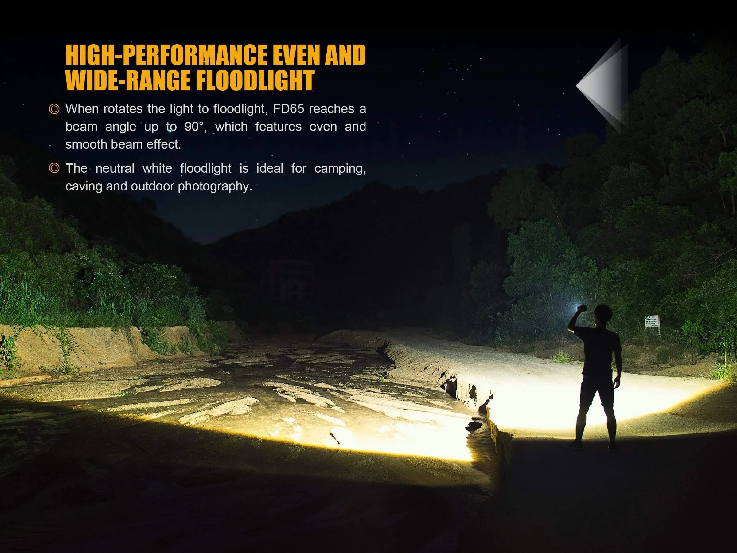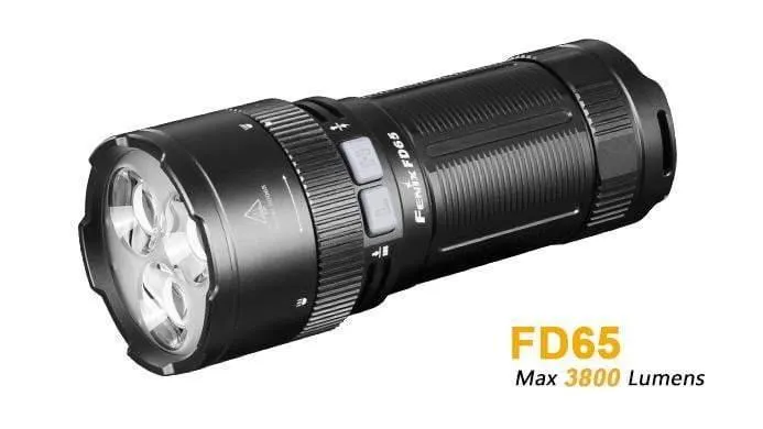 La lampe de poche focalisable à LED Fenix FD65 est équipée de trois LED blanches neutres Cree XHP35 HI. Elle comprend également une lentille optique TIR efficace qui émet une puissance maximale de 3800 lumens et une distance de faisceau de 1 345 pieds / 410 mètres. La rotation de la bague de mise au point sur le Fenix FD65 déplace la tête vers l’avant et vers l’arrière, ce qui entraîne un changement entre le spot et le projecteur.Fonctionnement simple à deux boutons – cliquez sur le commutateur « H » pour augmenter la puissance et augmenter la luminosité, puis cliquez sur le commutateur « L » pour activer la sortie basse et diminuer la luminosité. Il est normalement alimenté par quatre batteries rechargeables Li-ion 18650.Vous êtes en mesure d’utiliser seulement deux batteries 18650 en cas d’urgence. Avec une protection IP68, une fonction momentanée sur stroboscope et SOS, la Fenix FD65 est la lampe de poche idéale pour la spéléologie, la photographie extérieure,