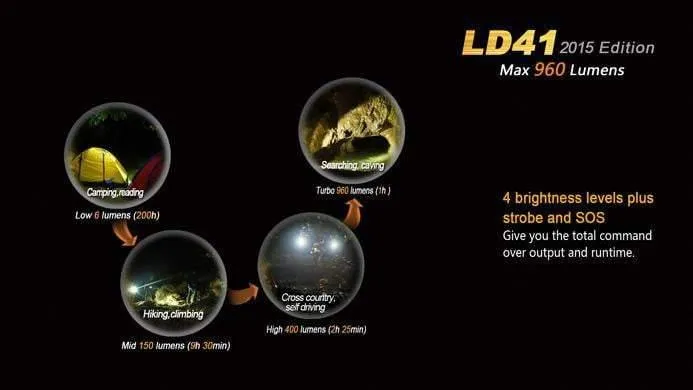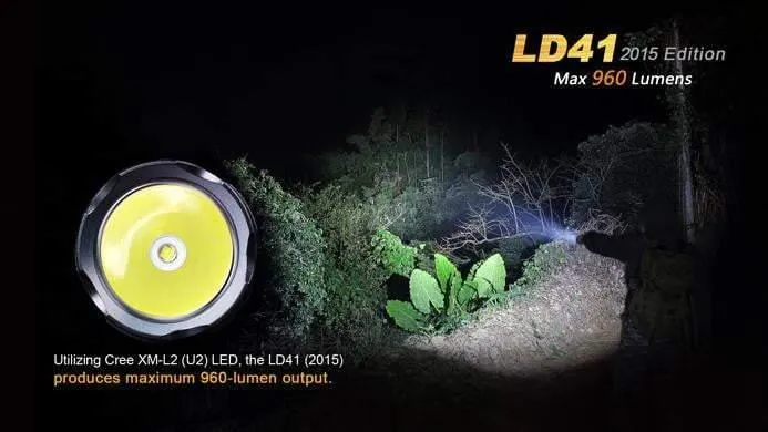 Par rapport à la LD41 précédente, la puissance de la LD41 édtion 2015 est supérieure. Grâce à la nouvelle LED Cree XML2-U2 le faisceau est plus large, ce qui vous permet d’éclairer un domaine plus grand, mais ceci est au détriment de la portée. C’est pour cette raison que la portée de la LD41 est quand même comparable à celle de la LD41 ancienne génération.