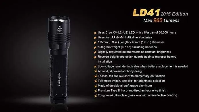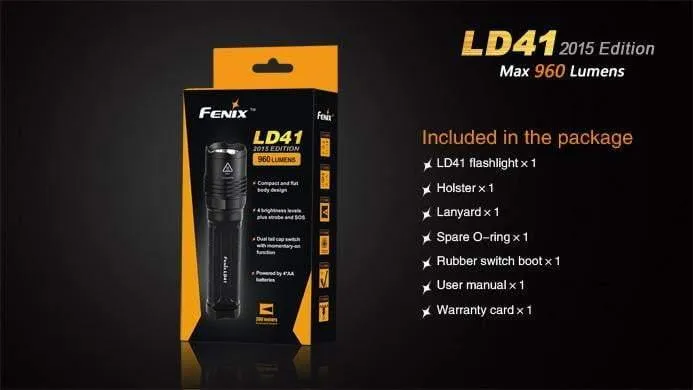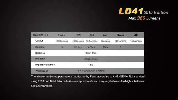 La lampe Fenix LD41 est une lampe de poche LED puissante et polyvalente avec une puissance maximale de 960 lumens ANSI*, alimentée par 4 piles AA.