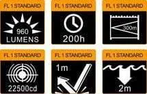 - Mode général, Faible (6 lumens, 200 heures), Moyen (150 lumens, 9 heures et 30 minutes), Élevé (400 lumens, 2 heures et 25 minutes), Turbo (960 lumens, 1 heure), stroboscope (960 lumens) et SOS (150 lumens)
