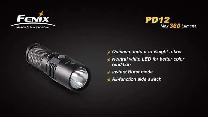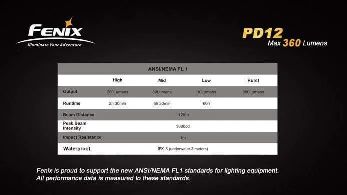 La Fenix PD12 est équipée d’une Cree XM-L2 LED (T6). La portée de la lampe est de 120mètres.