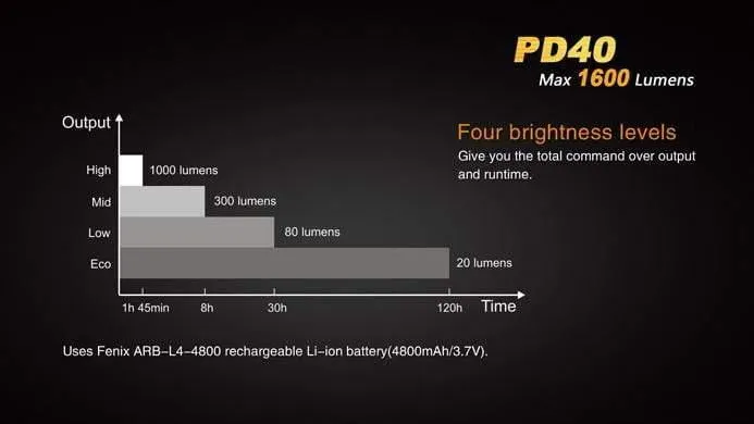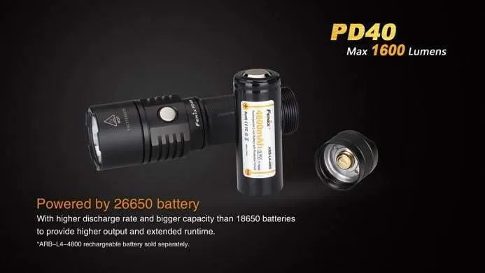 La PD40 utilise un accu 26650. La capacité de l’accu li-ion ARB-L4-4800 de Fenix est de 4800 mAh.