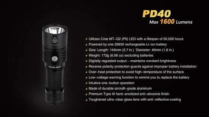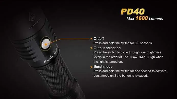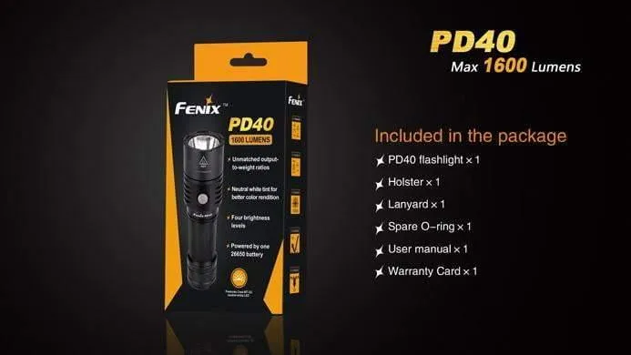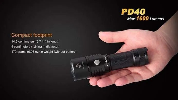 La Fenix PD40 est actuellement la lampe qui affiche le meilleur rapport lumière/poids dans l’assortiment de Fenix. Une lampe qui fait 14,5 cm de long et produit 1600 lumens en mode burst, du jamais vu.