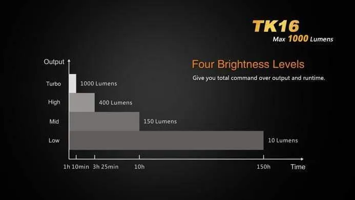 Le Fenix TK16 offre quatre modes de luminosité ainsi que le stroboscopique et va jusqu’à 1000 lumens de puissance maximale et une distance impressionnante en vue de sa taille jusqu’à 240 mètres.