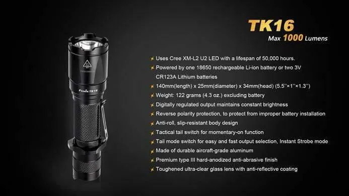 La nouvelle lampe de poche Fenix TK16 LED intègre fonctionnalité et performance, l’autonomie de ce modèle a tout d’une grande c’est un outil fiable et indispensable en cas d’urgence ou dans des situations tactiques.