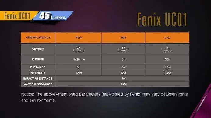 Petite lampe à LED ultra pratique avec trois niveaux d’éclairage pour une luminosité jusqu’à 45 lumens. Le niveau le plus faible permet d’utiliser la batterie LiPo intégrée pendant 50 heures maxi. L’affichage de la capacité vous informe à tout moment de l’état de charge. La batterie se recharge toujours rapidement via un port micro USB. Imperméable à l’eau conformément à la norme IPX-6. Le modèle Fenix UC01 est idéal dans toutes les situations.