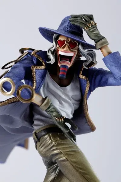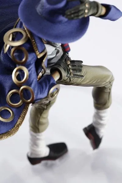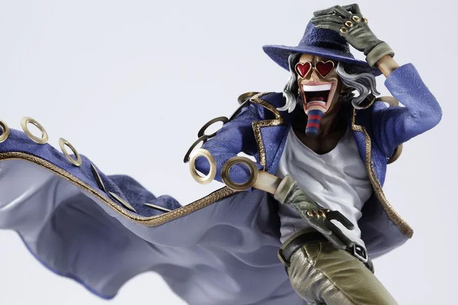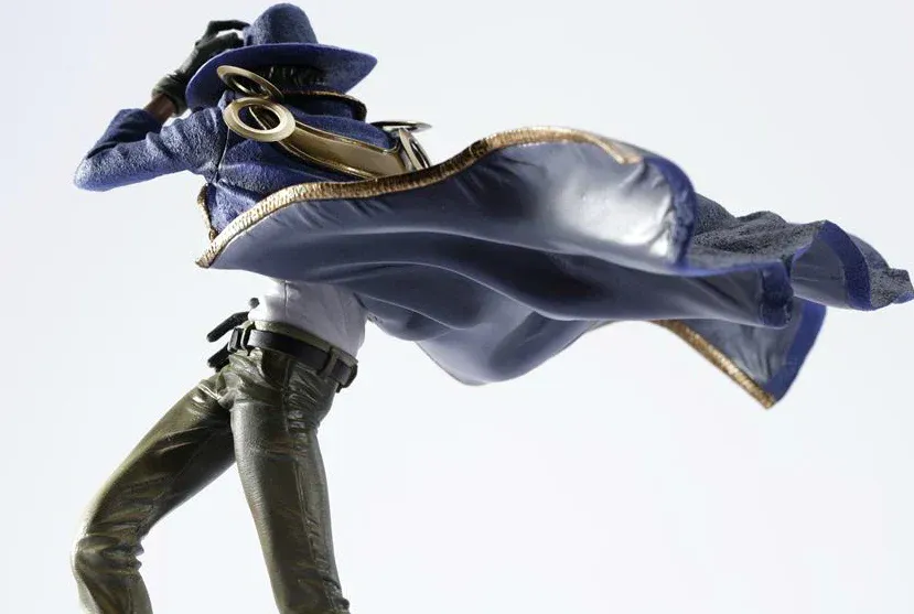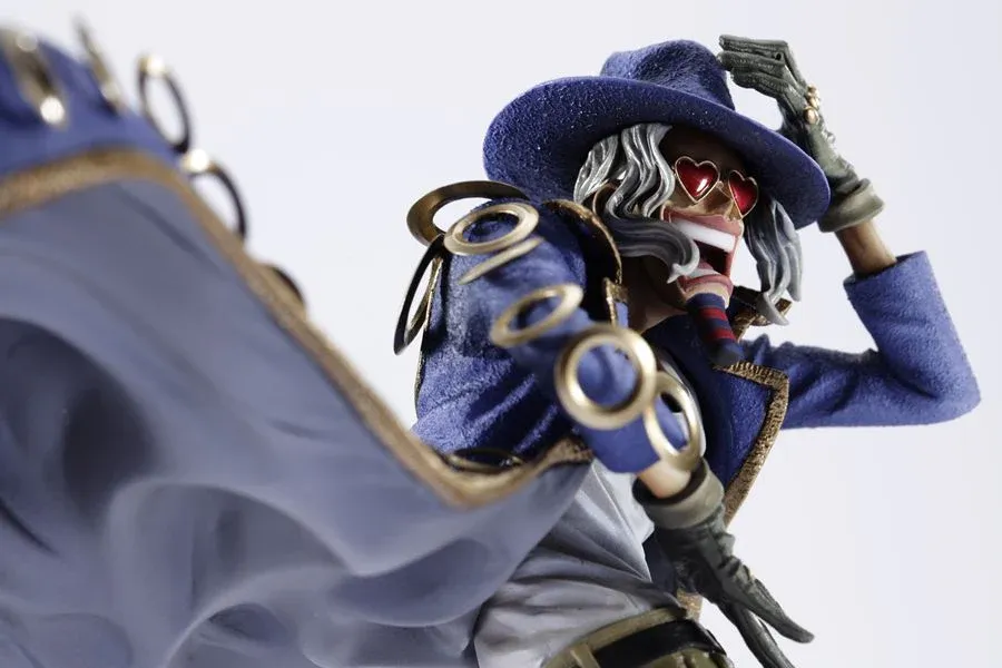 Les détails de cette figurine sont impressionnants : sa veste violette ornée de cercles dorés flotte au vent, ajoutant une touche de dynamisme à la pose. Son célèbre chapeau et ses lunettes en forme de cœur sont fidèlement reproduits, tout comme son sourire caractéristique. La sculpture met en avant la finesse de son costume, avec des plis réalistes sur son pantalon et un travail minutieux sur les textures des différents éléments.