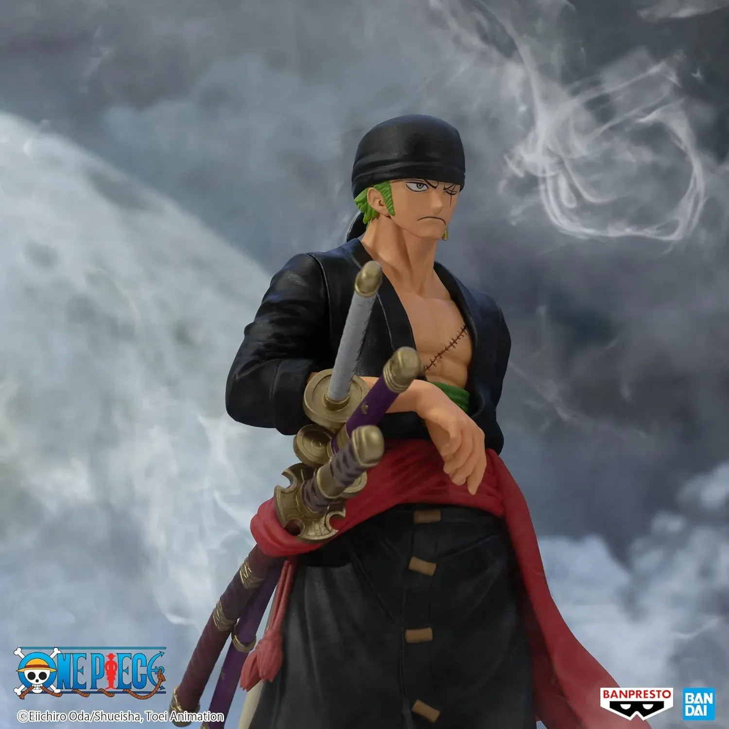 Cette figurine met en avant l’aura de détermination et de puissance de Zoro grâce à une sculpture détaillée et une peinture soignée. Son kimono noir, son bandeau sur la tête et la présence de ses trois sabres, dont le légendaire Wado Ichimonji, rappellent son style unique et sa maîtrise des techniques à trois lames. La dynamique de la figurine est accentuée par les plis du vêtement et l’attitude nonchalante mais imposante du personnage, fidèle à son charisme dans le manga et l’anime.