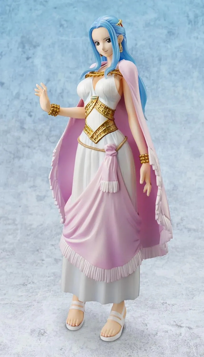 Chaque détail a été minutieusement travaillé pour capturer l’essence du personnage : sa chevelure bleue emblématique, son expression douce et déterminée, ainsi que sa tenue traditionnelle d’Alabasta, sublimée par des finitions soignées et des ornements dorés. Le drapé de sa robe rose et blanche est magnifiquement sculpté, donnant une impression de mouvement naturel.