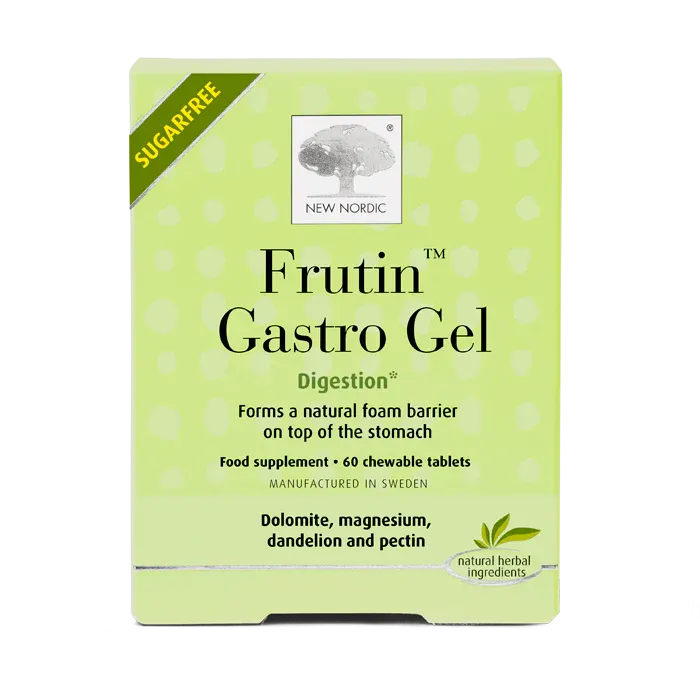 Frutin™ Gastro Gel sugar-free chewable tablets are naturally occurring and can be taken daily. Pectin (natural and micro-fruit fibres) creates a protective foam barrier on contact with the gastric liquid. Calcium, contributes to the normal functioning of digestive enzymes. *Dandelion supports a good digestion. Easy and pleasant to use with a mint taste.
