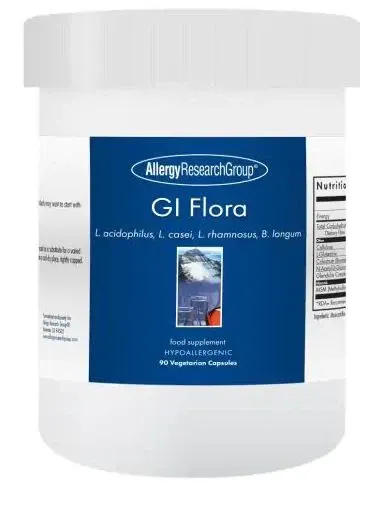GI Flora is a dairy-free combination of 4 beneficial probiotic bacteria: Lactobacillus acidophilus, L. rhamnosus, L. casei, and Bifidobacterium longum. Lyophilized (freeze dried).