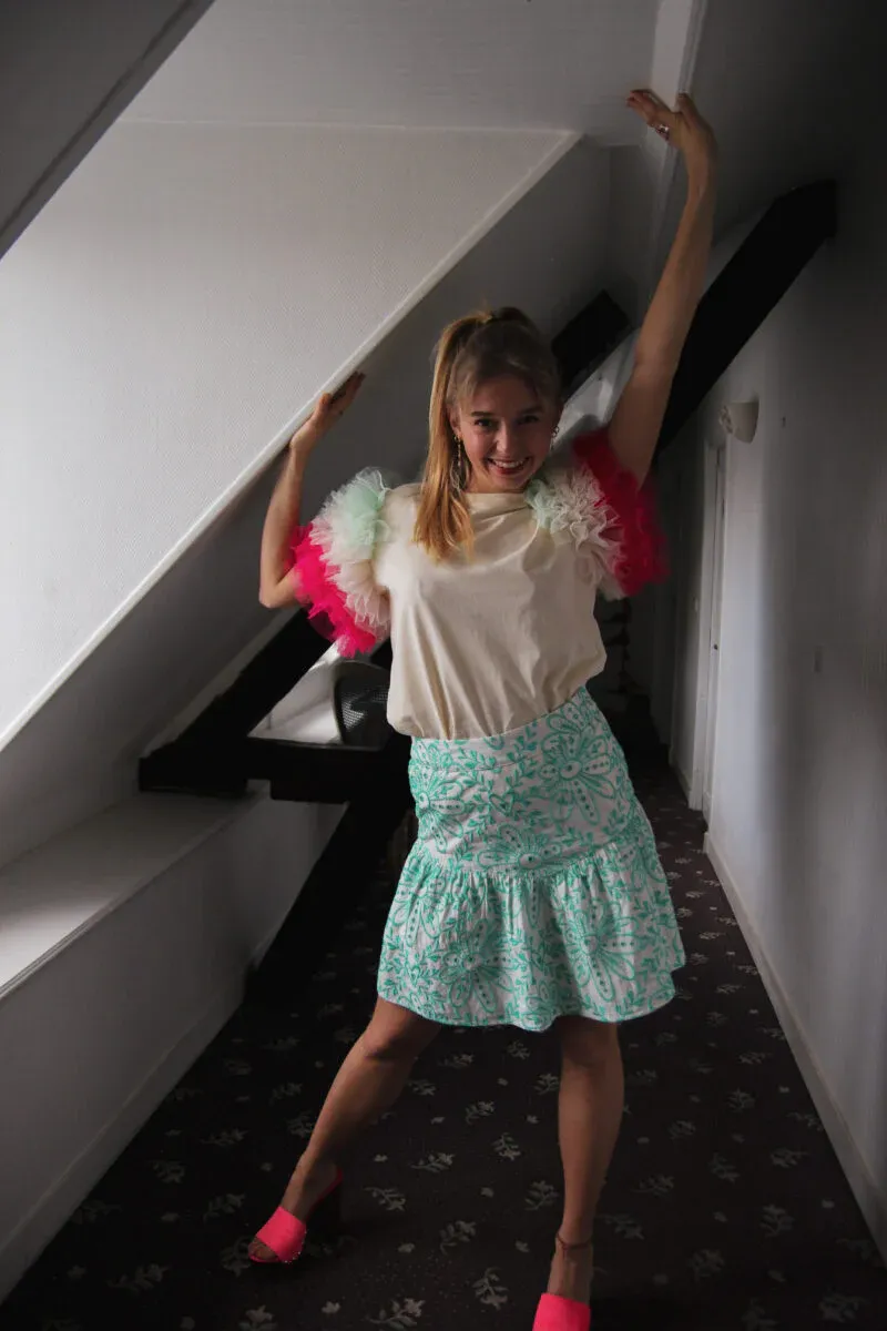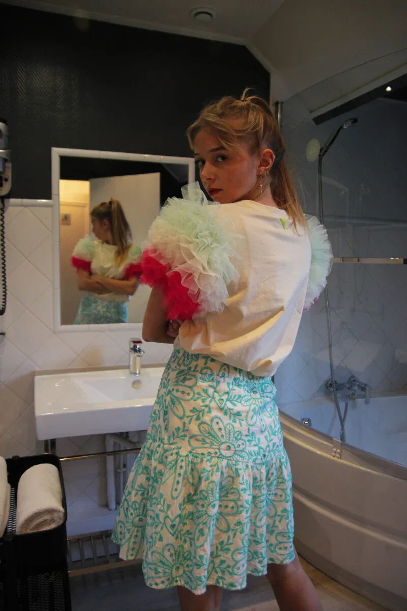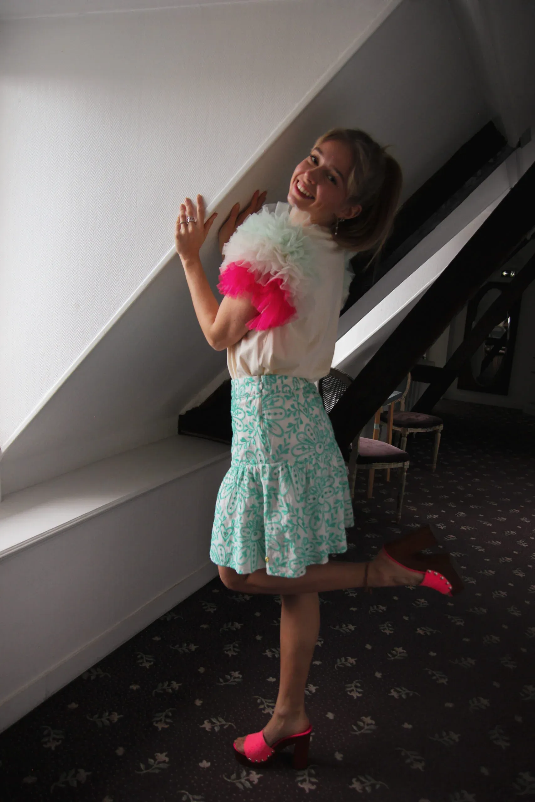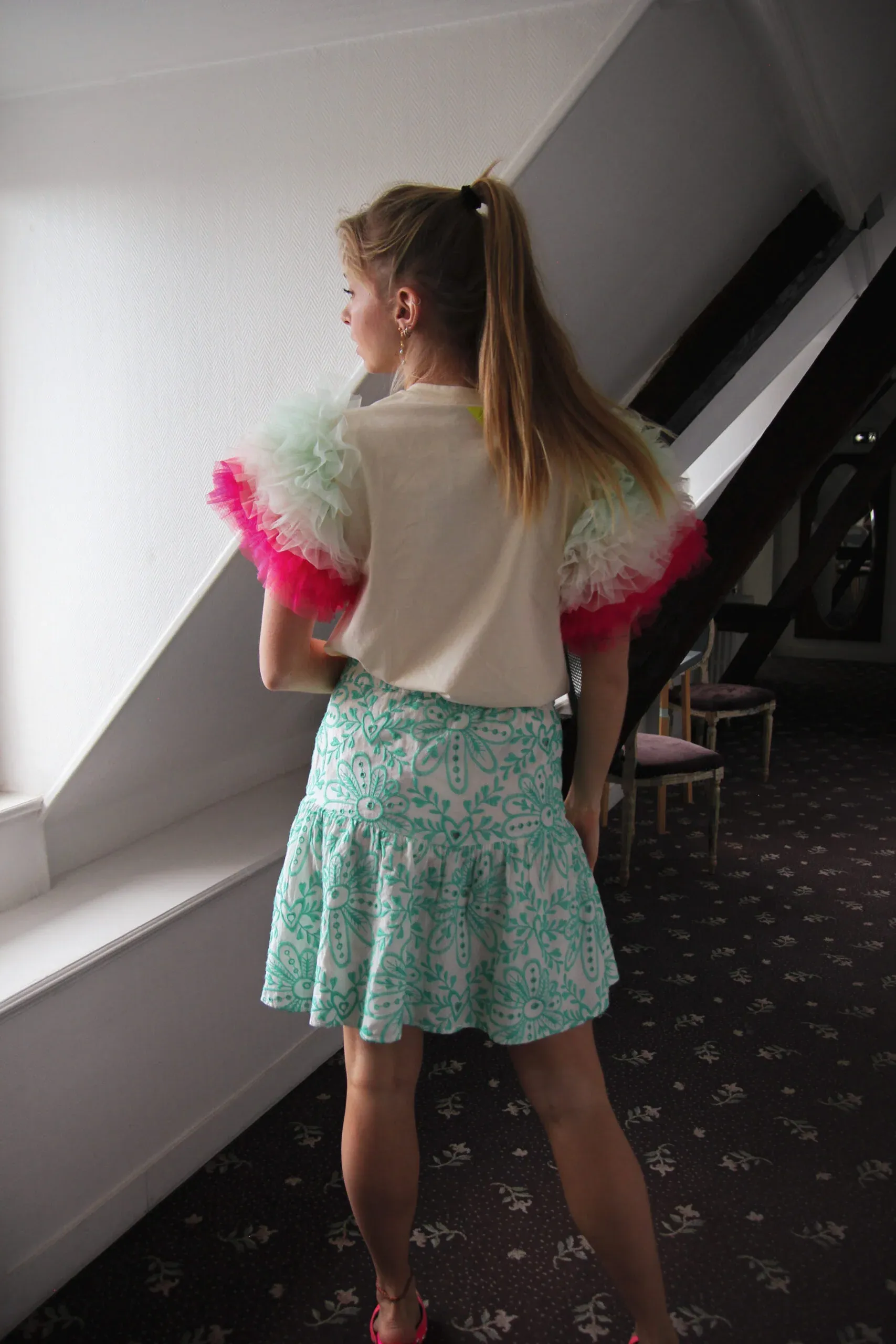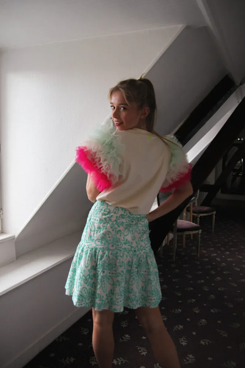 Cette jolie jupe Tony signée Fabienne Chapot au style va faire tourner des têtes avec sa couleur menthe et ses imprimés fleuris
