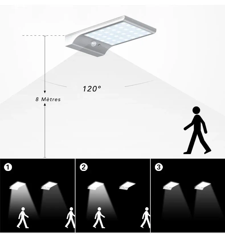 - Lumière Blanche Sensorielle : 3 Modes, longue portée, 120°