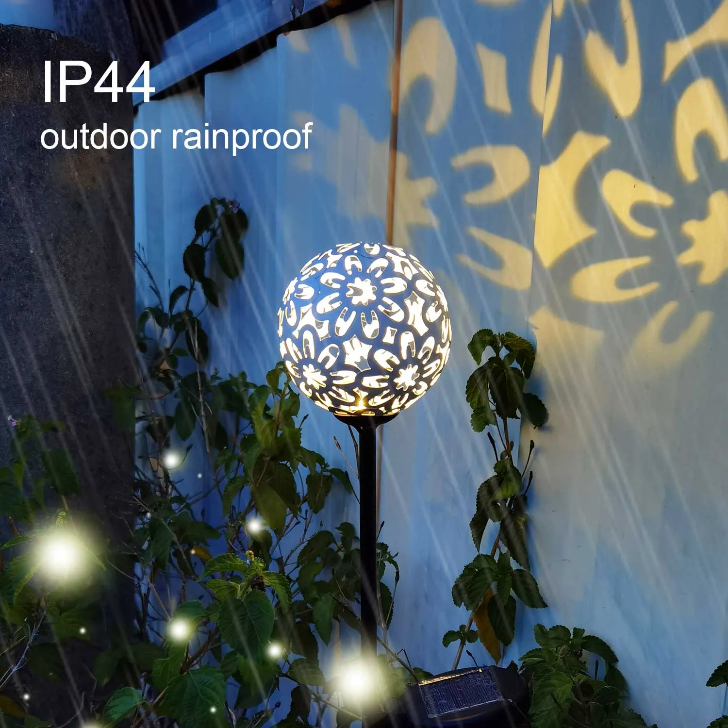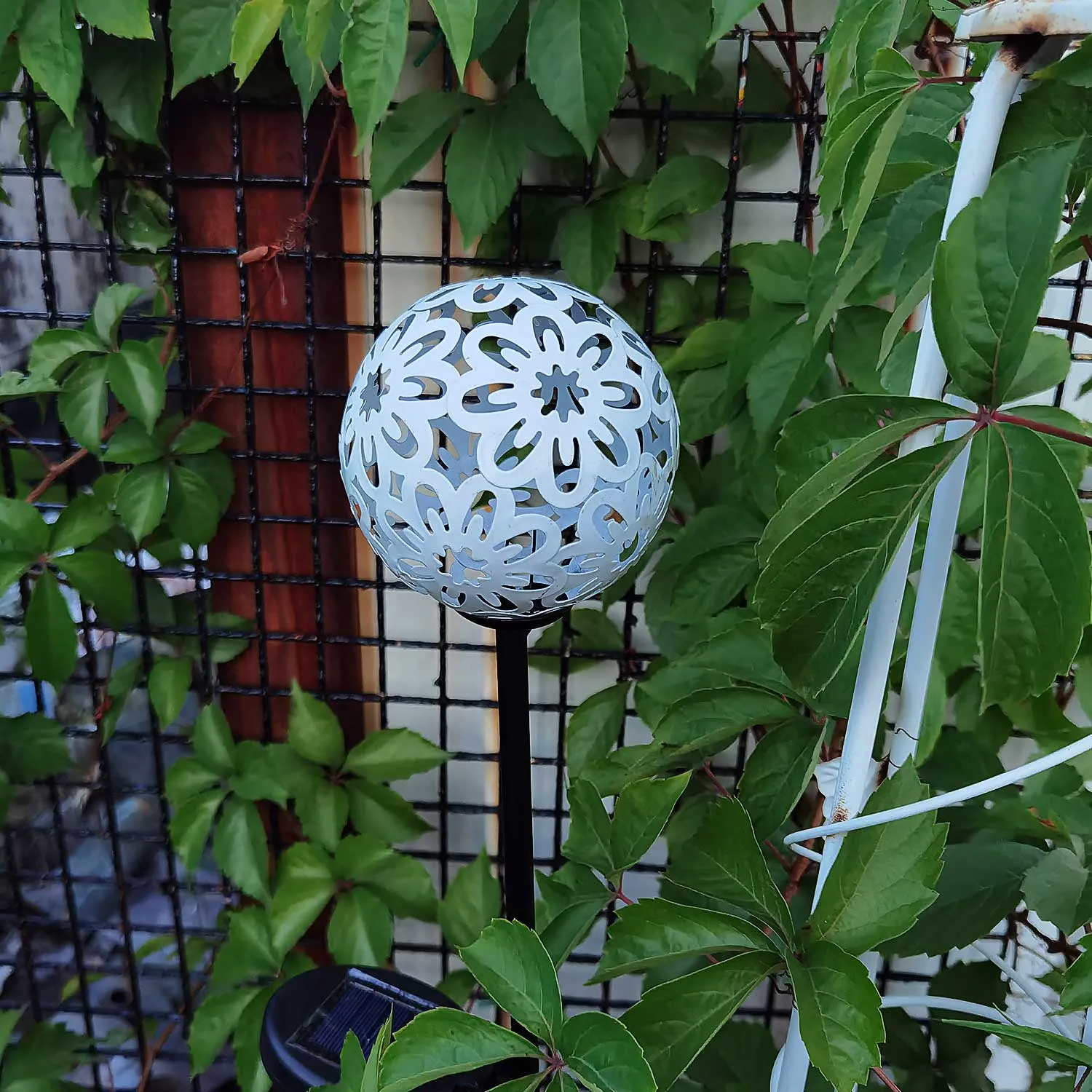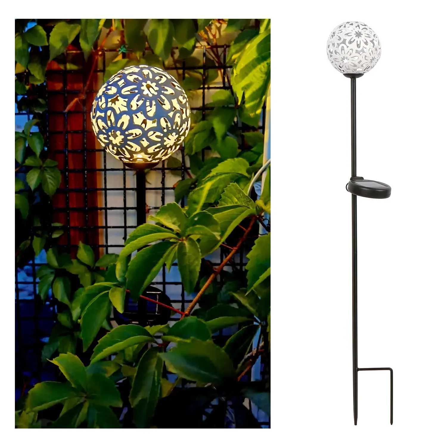 Lampe solaire jardin sur piquet en métal creuse avec motif en fleur blanc et en forme de boule idéale pour agrémenter votre extérieur. Avec la puissance de la LED très économe, c’est l’éclairage parfait. Adoptez l’énergie verte pour une maison plus écoresponsable.