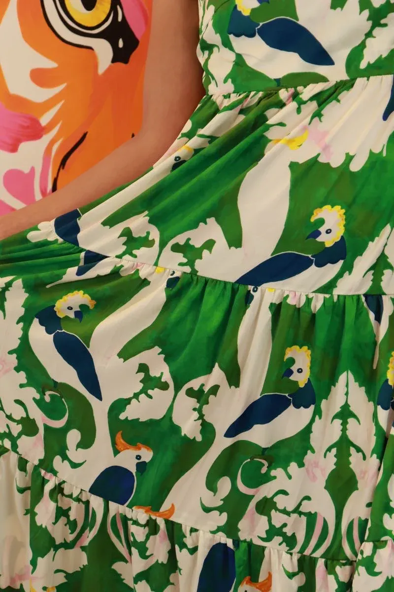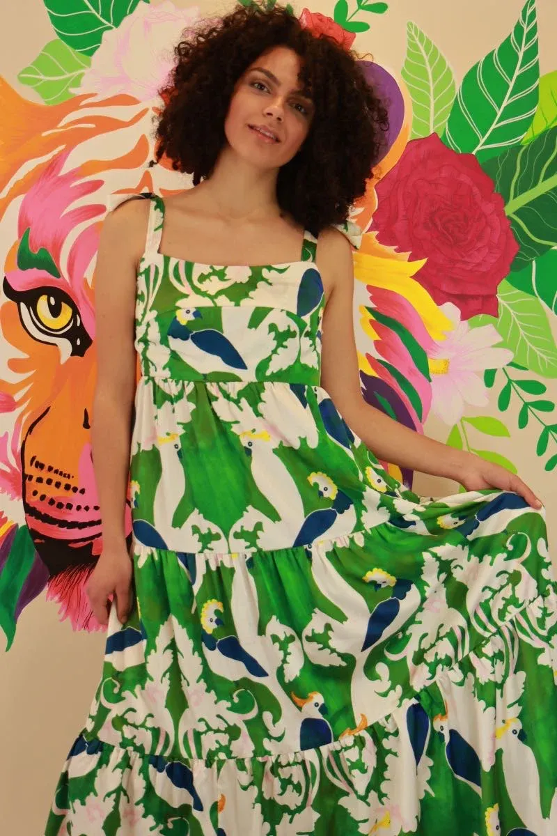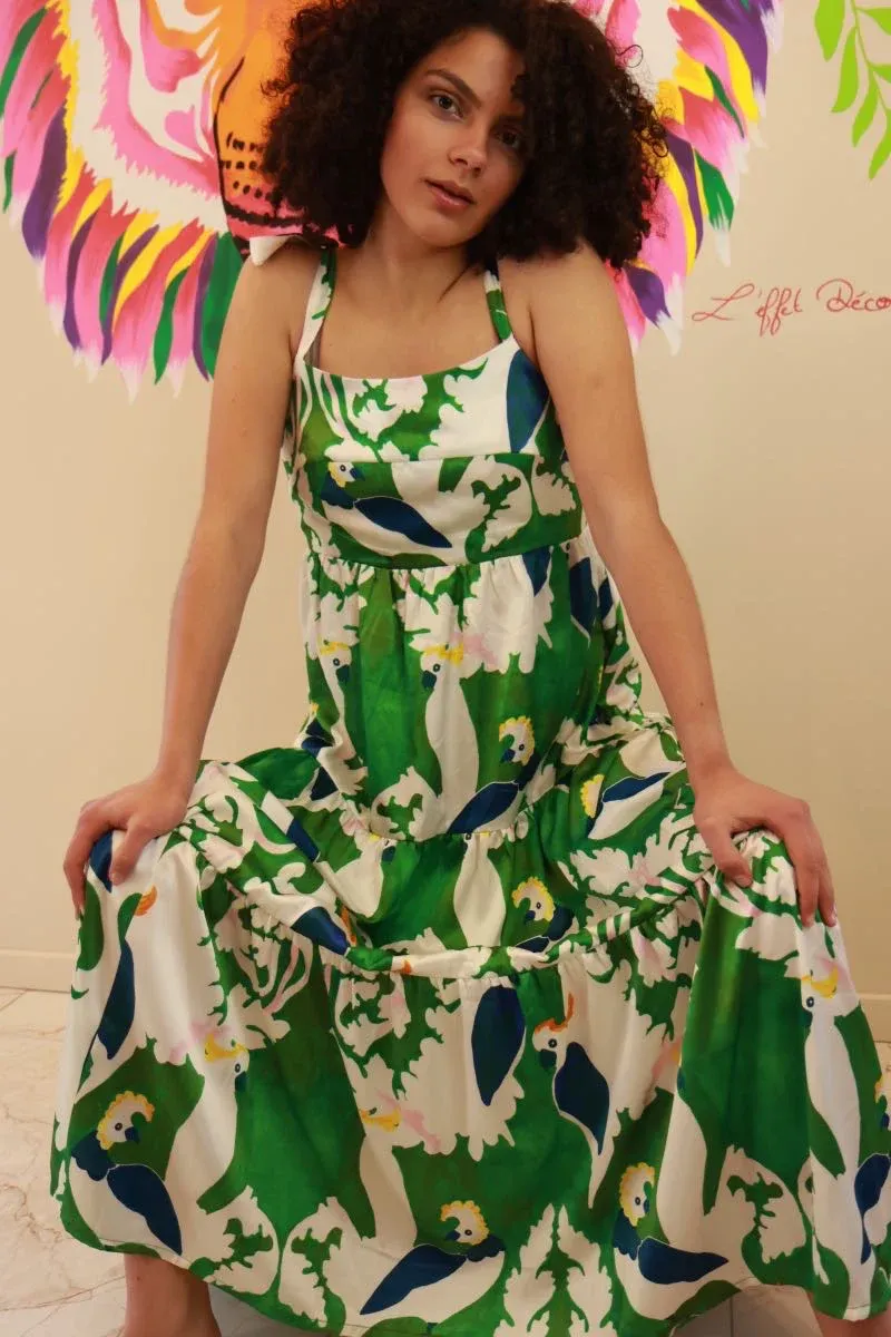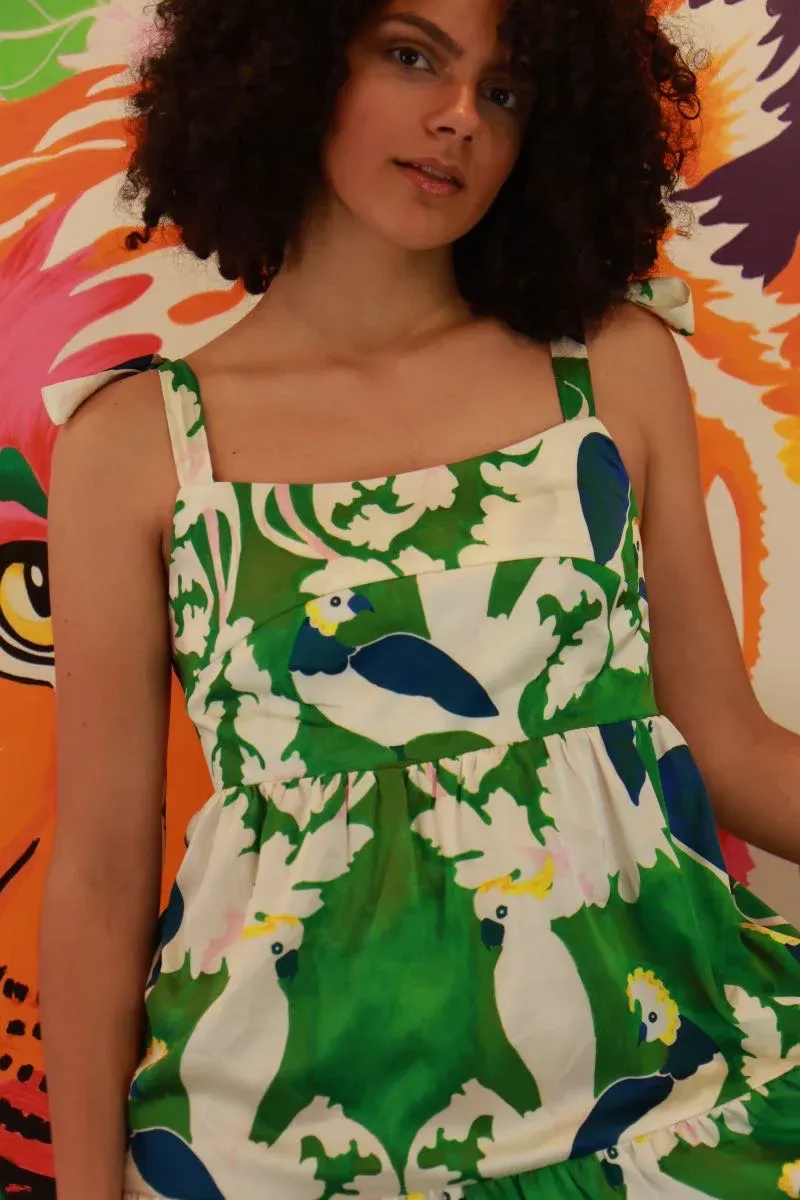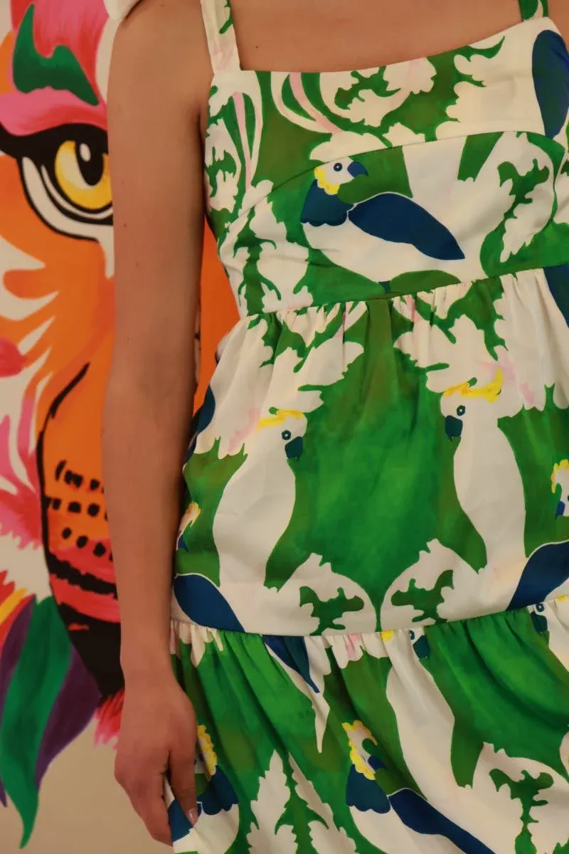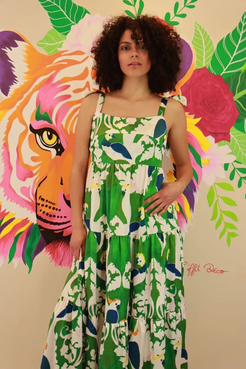 Plongez dans l’exotisme avec la robe à bretelles réglables de Traffic People – un véritable festival de couleur et de fantaisie. Ornée d’un imprimé estival mettant en scène des perroquets exotiques sur un fond vert et blanc, cette robe est une invitation à la fête tropicale dans votre garde-robe. Les bretelles réglables vous permettent de personnaliser votre look, garantissant un ajustement parfait pour chaque silhouette.