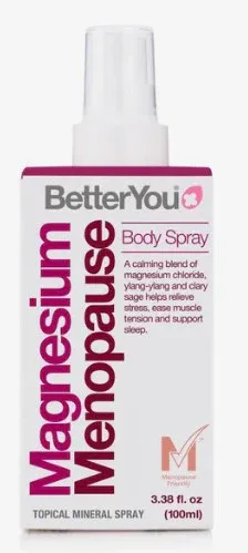 Better You Magnesium Menopause Body Spray contains transdermal magnesium chloride for topical use during menopause. Menopause Body Spray also includes ylang-ylang and clary sage to ease muscle tension, relieve stress, and support a good night’s sleep which are common problems associated with perimenopause and menopause.