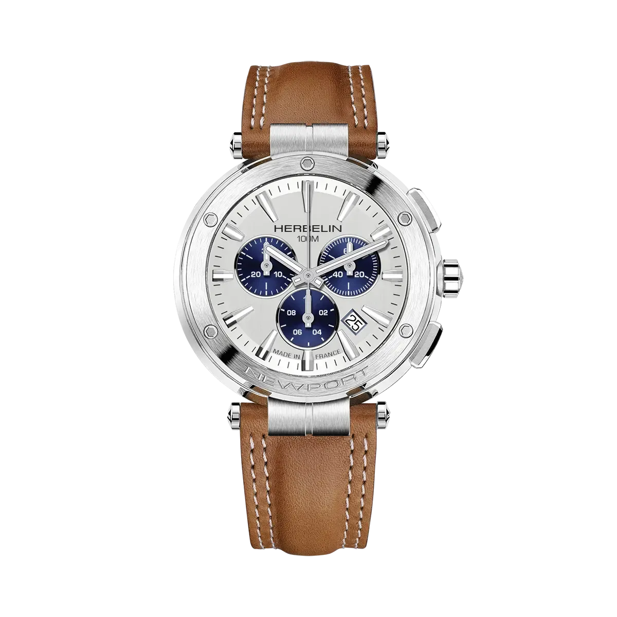 Découvrez l’esprit chic et l’architecture racée de la Montre Michel Herbelin Newport Chrono Fond Argent. Cette nouvelle génération de la collection emblématique HERBELIN présente un boîtier en acier, un cadran argent brossé marqué par trois compteurs bleus évoquant les nuances de la mer méditerranéenne. Accompagnée d’un bracelet en cuir marron, cette Newport allie élégance et sportivité, tandis que la roue marine gravée sur fond démontre le souci du détail propre à HERBELIN. Une montre qui habille avec style les poignets masculins.