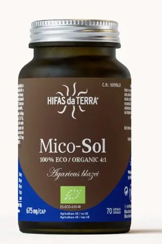 *NRV: Nutritional Reference Values CONTENTS70 capsules (675 mg) of pure, standardised extract from the Hifas da Terra sun mushroom, selected from individual strains with the best analytical results. Mico Sol contains only pure, organic extracts from the fruiting body of the “Royal Sun Mushroom” or Agaricus blazei Murill. Ingredients per two capsules: Organic fruiting body extracts of Agaricus blazei 990 mg (73.33%), vegetable capsule (purified water, purple carrot juice concentrate), organic acerola Malpighia glabra 35.29 mg (6 mg of Vitamin C (7.5% NRV*) RECOMMENDED DOSAGE FOR MICO SOLRecommended daily dose: 2 capsules per day (or as prescribed by a qualified health practitioner), on an empty stomach or outside meals. Duration of application: at least 2 months. GENERAL PRECAUTIONS