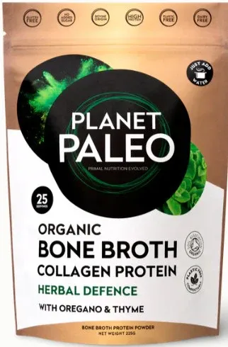 Here at Planet Paleo we have made it easy for you to obtain the unique benefits of this ancient healing food by bringing bone broth back into the modern world in a convenient, easy to use form. We slowly simmer our bone broth to release all the powerful nutrients and then carefully dehydrate it into a powder. Then we blend it with a range of delicious organic herbs including garlic, oregano, and thyme. These provide a full-bodied, aromatic flavour as well as powerful compounds to support seasonal health. Finally, we add ginger to this herbal mix: a warming spice that aids digestion, wellbeing and is often used as a traditional aid to immune defence.