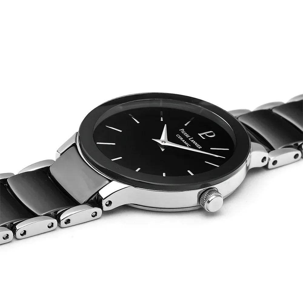 Ce merveilleux modèle allie caractère et minimalisme de par ses aiguilles et mouvements finement argentés par dessus un cadran noir et un bracelet entouré d’acier.