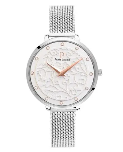 Ce modèle Pierre Lannier reflète douceur et élégance avec son cadran constitué de fins index empierrés accompagnés d’un blanc laqué orné de minutieuses arabesques bucoliques.