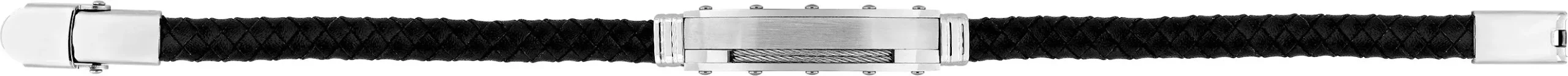 Messieurs, laissez-vous tentez par l’intemporel bracelet en cuir synthétique noir assorti à sa barrette en acier inoxydable incrustée de fils de câbles gris. Vous allez faire toute la différence.