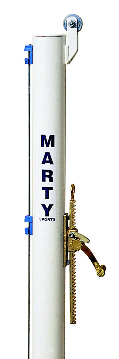 Tension du filet rectiligne par treuil à crémaillère, maintien des filets le long des poteaux par tiges coulissantes –