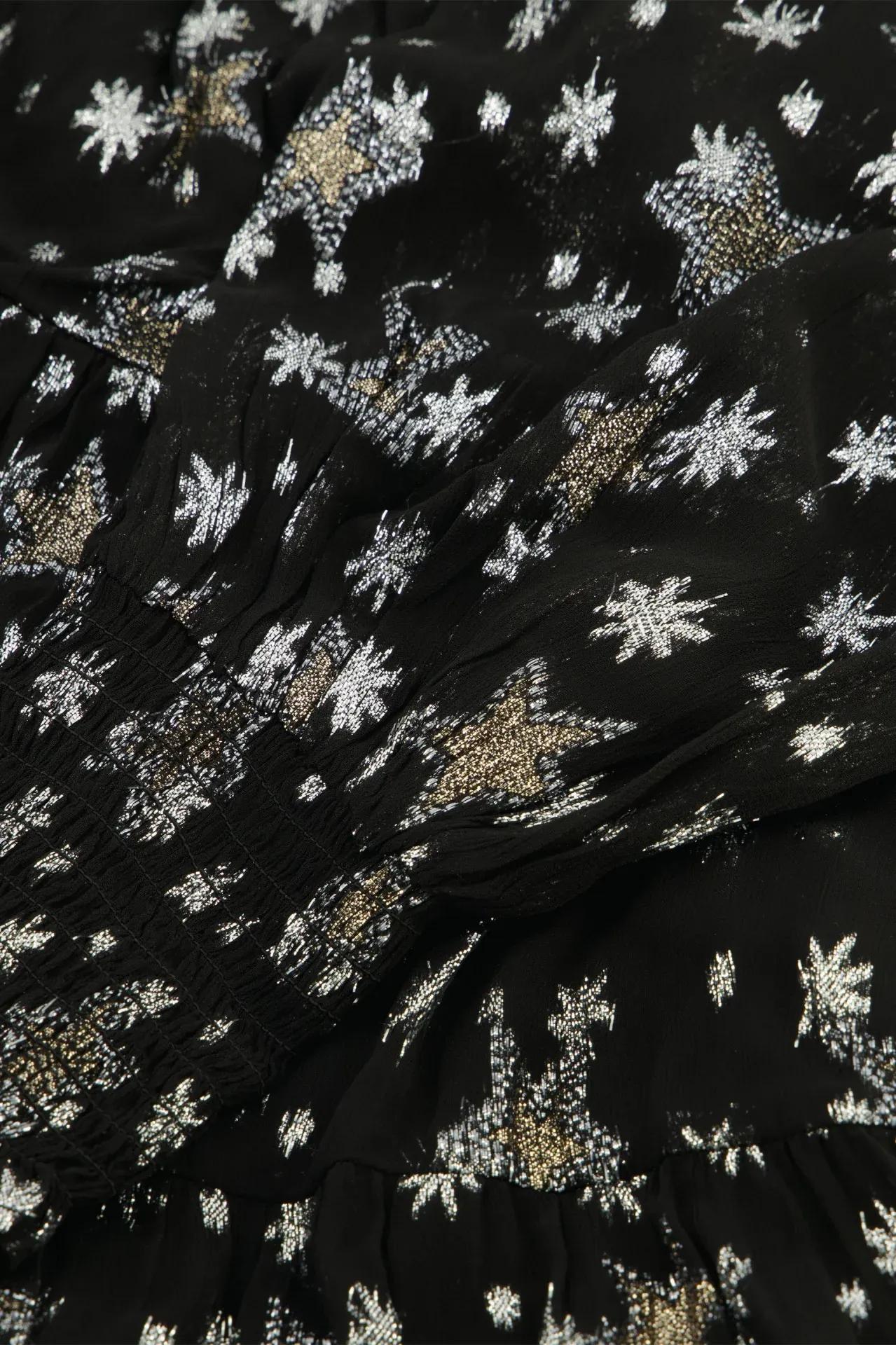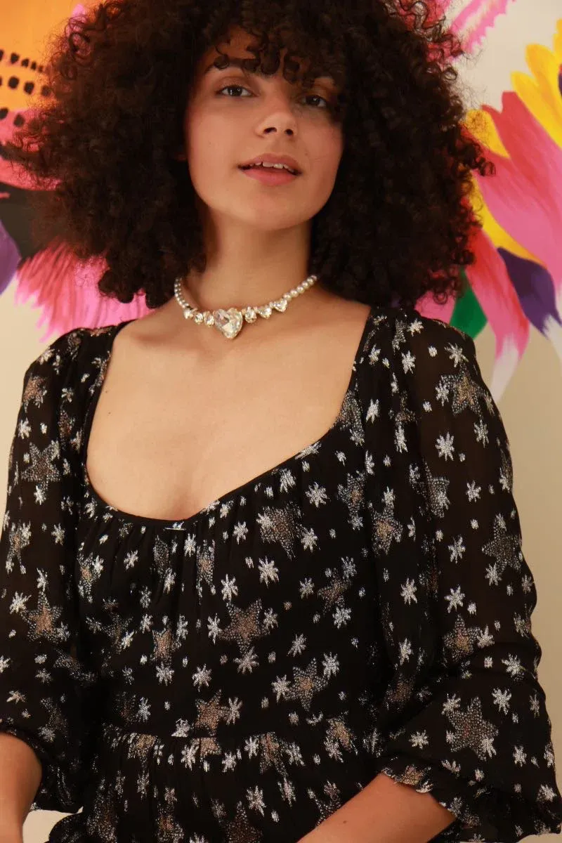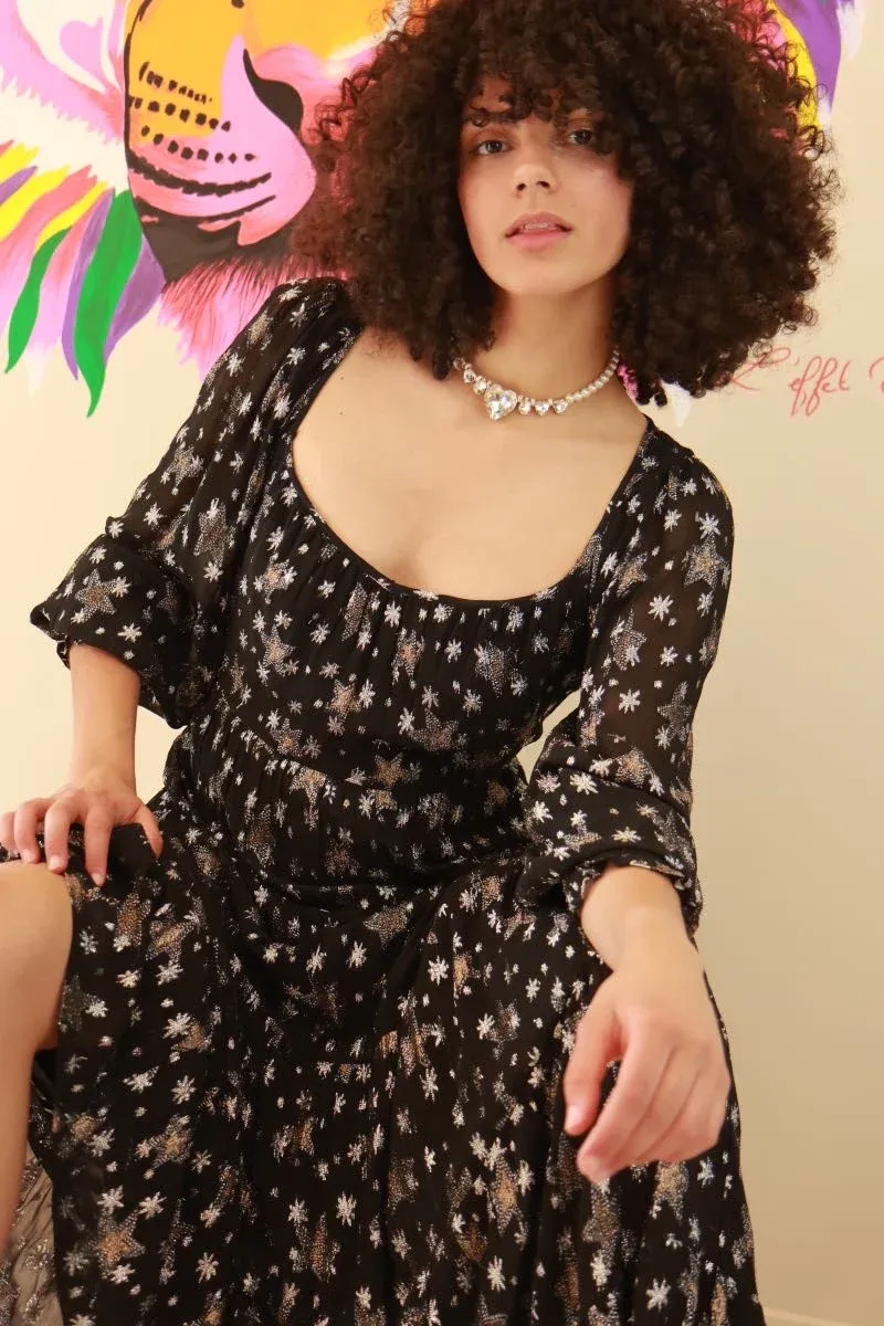 La robe Folie de Fabienne Chapot : élégante robe noire à motif d’étoiles dorées et argentées, doublée et fluide. Idéale pour cérémonies d’été ou soirées chics.