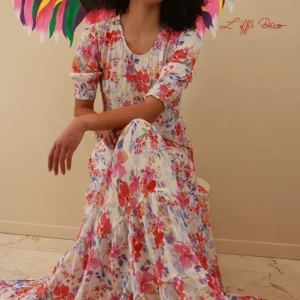 Confectionnée dans un tissu doux et vaporeux en polyester et viscose, doublée pour votre confort, elle assure un tombé impeccable sans transparence. Les manches légèrement bouffantes, resserrées par un poignet élastiqué, ajoutent du volume et une note romantique. La taille est cintrée par une ceinture à nouer ton sur ton (amovible selon vos envies), ce qui met en valeur la silhouette tout en gardant une aisance de mouvement. Le bas de la robe, évasé et fendu, offre une allure féminine et libérée, idéale pour dévoiler subtilement la jambe et faciliter vos pas de danse !